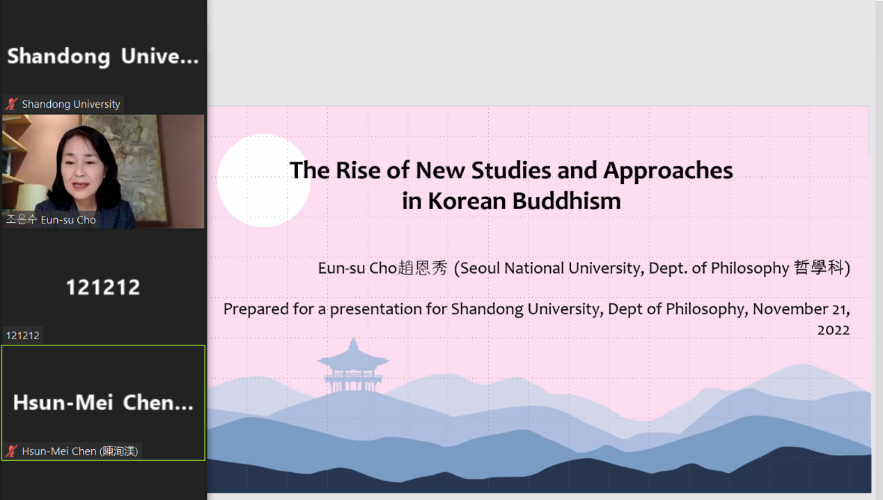11月21日,韩国首尔国立大的赵恩秀教授做客“望岳海外名家讲坛(第8期)”,给公司师生带来一场题为“The Rise of New Studies and Approaches in Korean Buddhism(韩国佛教新研究和新方法的兴起)”的讲座。讲座由公司王文方老师主持,由京都大学哲学系博士候选人陈洵美担任评论人。