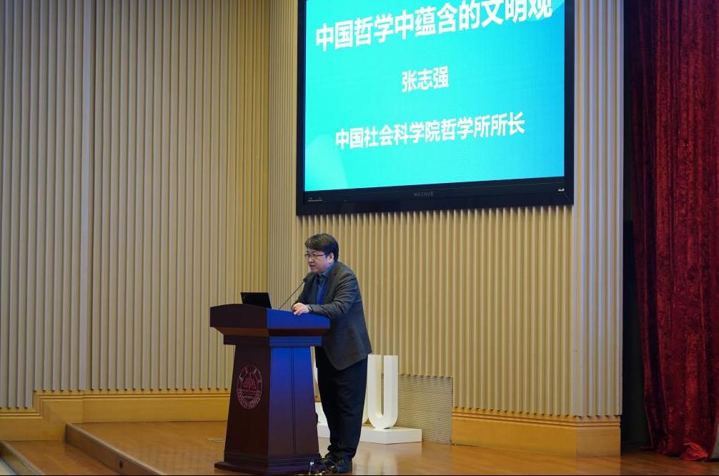 张志强的报告以“中国哲学中蕴含的文明观”为主题,着重谈及了“文化生命体”这一概念,并以此来理解中华民族现代文明。他认为,西方的文明观实际上一种文化等级论,而中国的文明观是通过汉字表达的他通过分析《周易》中的“文明”概念及“文”的字形起源,阐述了文字对于中华文明的重要意义。