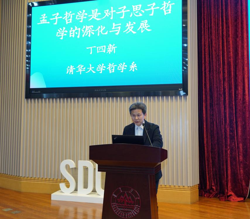 丁四新教授的报告以“孟子哲学是对子思子哲学的深化与发展”为主题。他依据传世文献《中庸》及出土文献郭店楚简《五行》等材料,从性善之大本大源的安置、君子与圣人的区分、工夫论之改造三个方面分析了孟子对子思子哲学的继承与深化。此外,他还基于先秦儒家经典中以“子曰”开头及引用《诗》《书》为特点的文本结构,推论出其中蕴含的儒家道统思想。