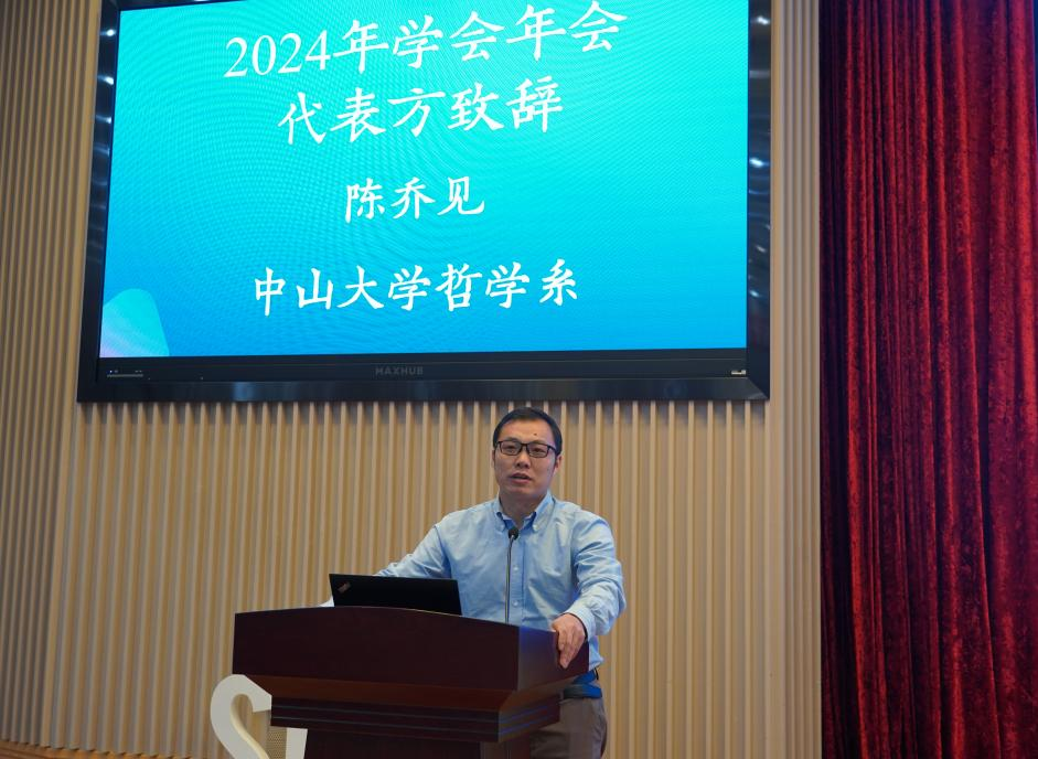 中山大学哲学系主任助理陈乔见教授作为下一届年会的举办方代表致辞。他表示,2024年恰逢中大建校100周年暨中大哲学系建系100周年,中山大学哲学系有强烈的承办意愿,欢迎各位学者届时到访中大。