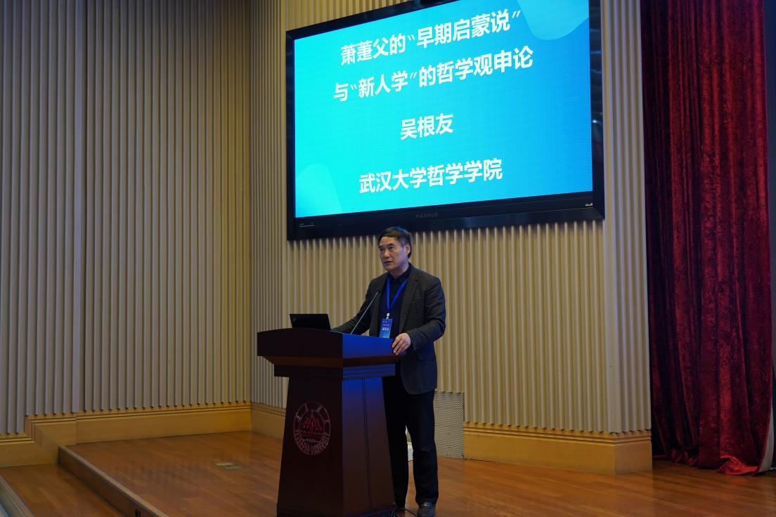 吴根友教授的报告以“萧萐父的‘早期启蒙说’与‘新人学’的哲学观申论”为主题。他认为,萧萐父晚年试图以自己所建构的“诗化哲学”形式来超越西方哲学在中世纪所具有的宗教迷狂和现代实证主义的狭隘,其“早期启蒙说”所蕴涵的对人的全面性的追求,以及其所提出的“哲学即人学”的哲学观,对于当代中国人的现代化和中国哲学主体之追求,均具有思想的启迪意义。
