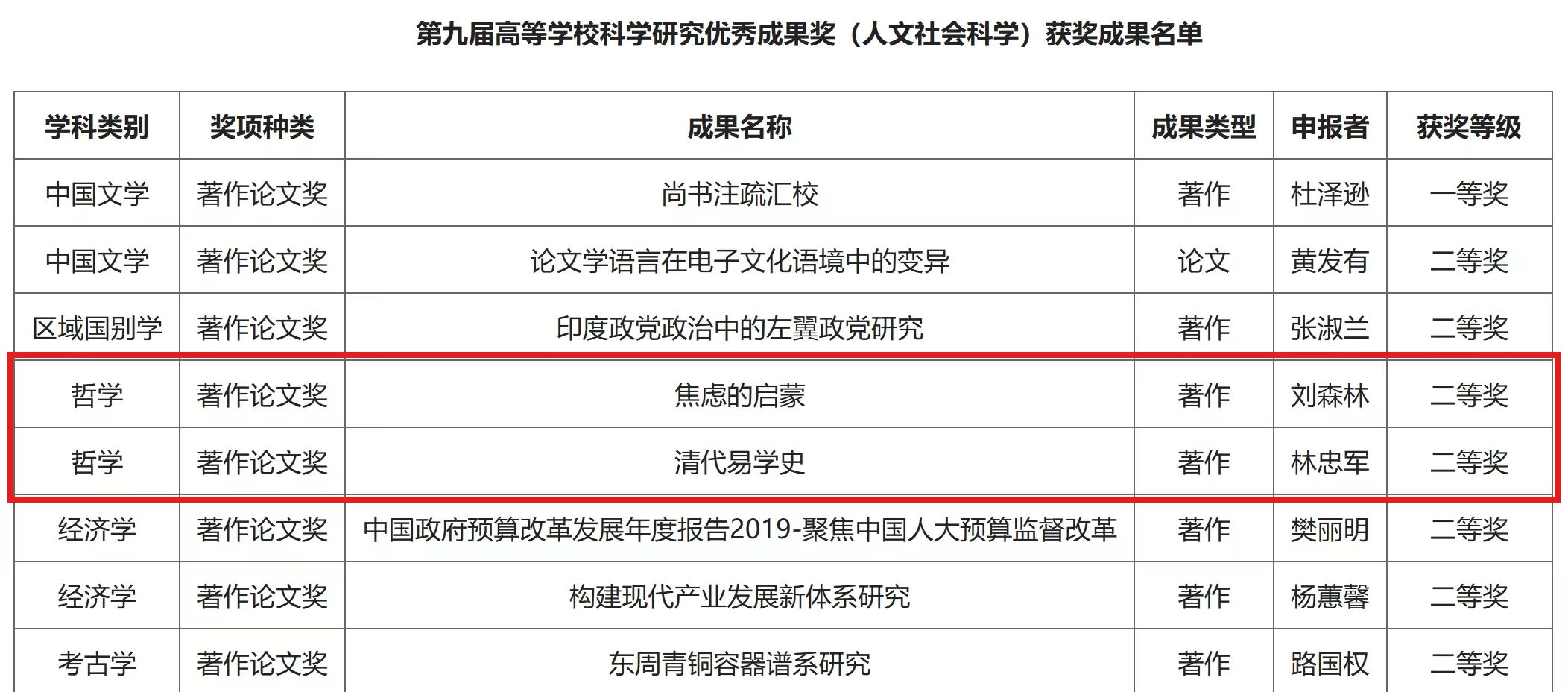 近日,教育部印发《关于第九届高等公司科学研究优秀成果奖(人文社会科学)奖励的决定》。申博sunbet刘森林教授参评的成果《焦虑的启蒙》、公司易学与中国古代哲学研究中心林忠军教授参评的成果《清代易学史》获得著作论文二等奖。