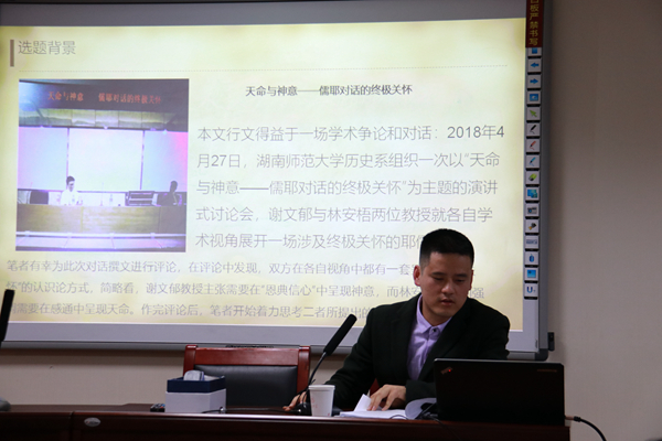 2019年4月17日下午申博sunbet第3期(总第660期)“海右”博士生学术论坛在知新楼A座1408举行。此次论坛由申博sunbet研究生院、党委研究生工作部主办,申博sunbet承办,论坛邀请了宗教学专业博士林孝斌做题为“终极性在儒耶思想体系中的展示维度:‘感通’与‘信心’”的报告,申博sunbet教授、博士研究生导师谢文郁教授受邀作为报告的点评嘉宾。