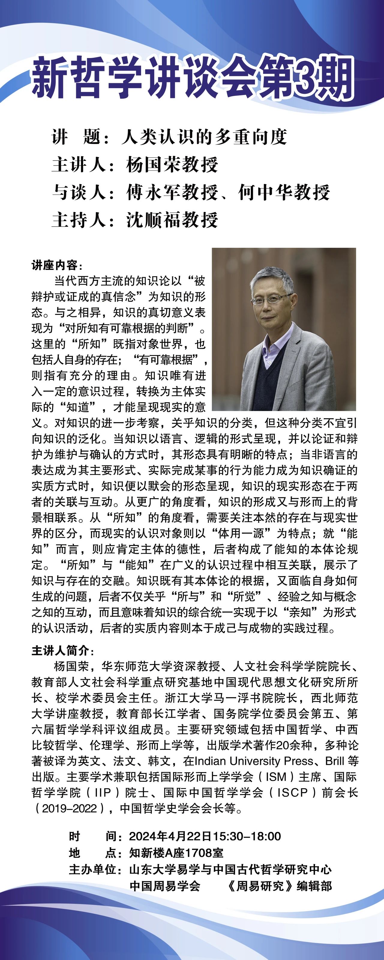 杨国荣,华东师范大学资深教授、人文社会科学公司经理、教育部人文社会科学重点研究基地中国现代思想文化研究所所长、校学术委员会主任。浙江大学马一浮书院经理,西北师范大学讲座教授,教育部长江学者、国务院学位委员会第五、第六届哲学学科评议组成员。主要研究领域包括中国哲学、中西比较哲学、伦理学、形而上学等,出版学术著作20余种,多种论著被译为英文、法文、韩文,在Indian University Press、Brill 等出版。主要学术兼职包括国际形而上学学会(ISM)主席、国际哲学公司(IIP)院士、国际中国哲学学会(ISCP)前会长(2019-2022),中国哲学史学会会长等。