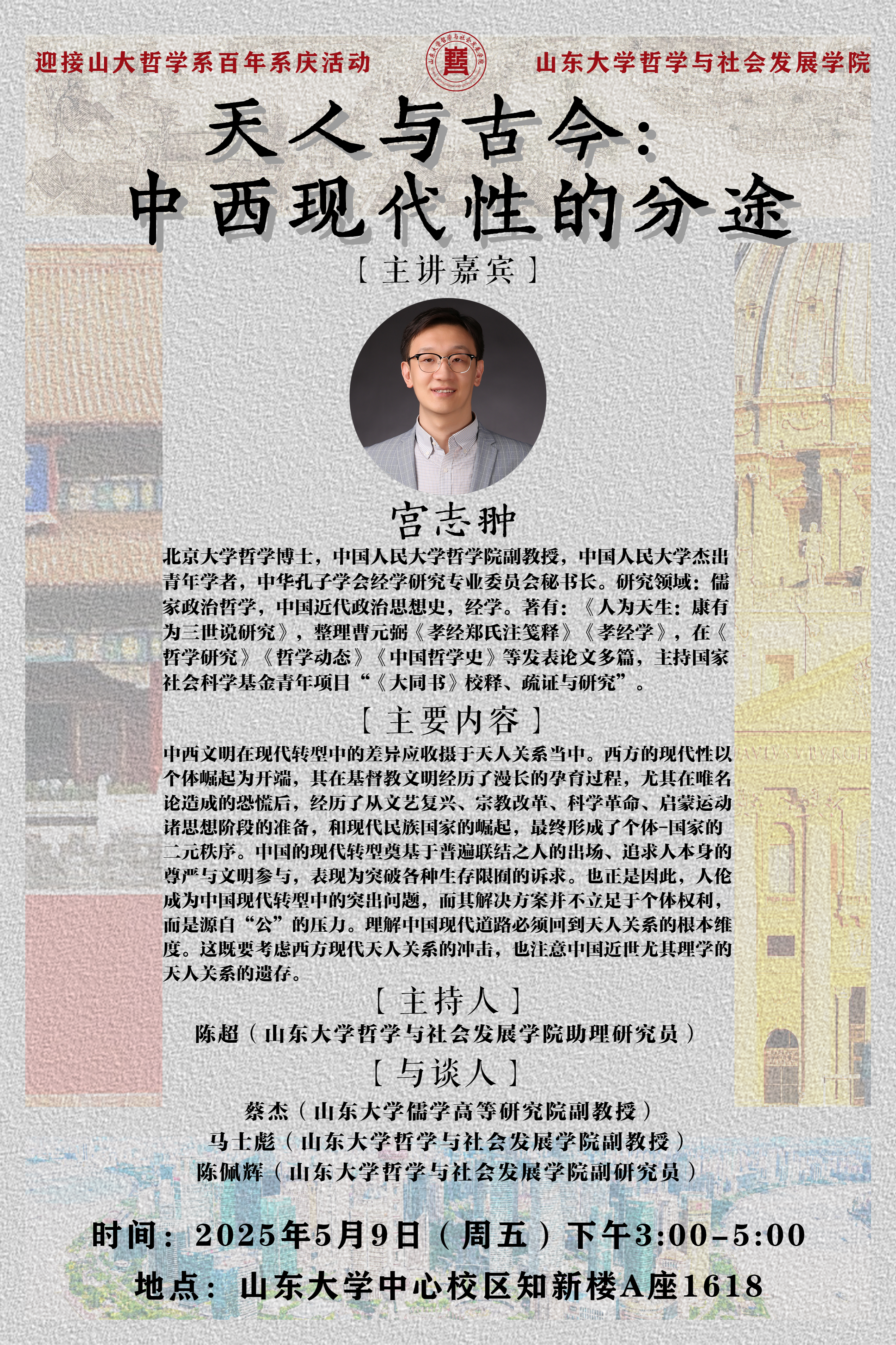宫志翀,北京大学哲学博士,中国人民大学哲公司副教授,中国人民大学杰出青年学者,中华孔子学会经学研究专业委员会秘书长。研究领域:儒家政治哲学,中国近代政治思想史,经学。著有:《人为天生:康有为三世说研究》,整理曹元弼《孝经郑氏注笺释》《孝经学》,在《哲学研究》《哲学动态》《中国哲学史》等发表论文多篇,主持国家社会科学基金青年项目“《大同书》校释、疏证与研究”。