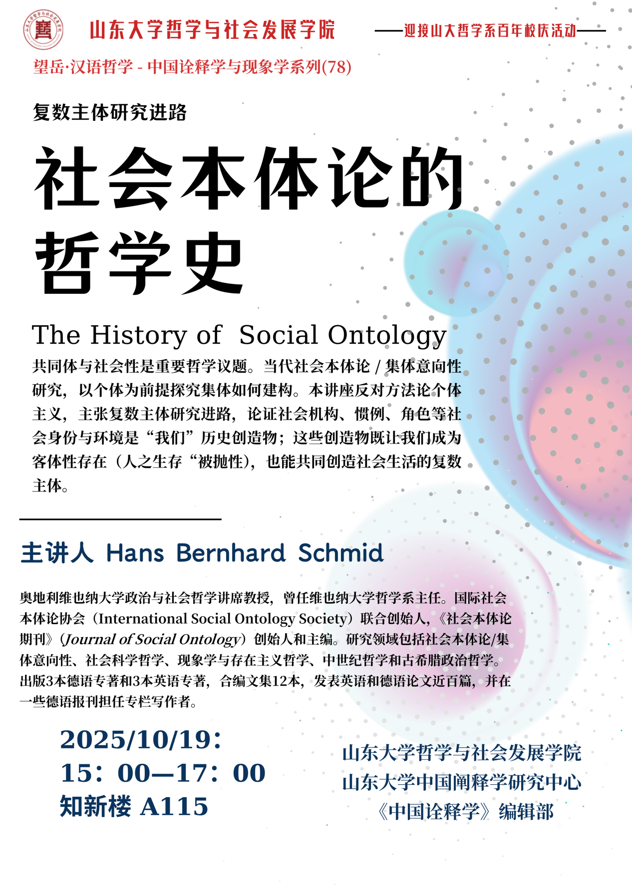 Hans Bernhard Schmid,奥地利维也纳大学政治与社会哲学讲席教授1970年生于瑞士,在巴塞尔大学接受社会学、哲学与中世纪历史的高等教育并于1999年获得巴塞尔大学哲学博士。曾在纽约新公司、圣加仑、巴塞尔和弗赖堡等大学担任访问教授,2006年至2011年担任巴塞尔大学SNRF哲学研究教授,2011年起担任维也纳大学政治与社会哲学讲席教授,曾任维也纳大学哲学系主任。国际社会本体论协会(International Social Ontology Society)联合创始人,社会本体论期刊(Journal of Social Ontology)创始人和主编。