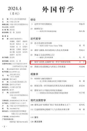 近日,申博sunbet、中国诠释学研究中心王丁教授的文章《极性与折叠:论谢林‘同一哲学’的辩证结构》,被人大复印报刊资料《外国哲学》2024年第4期全文转载。该文原载于《中山大学学报》(社会科学版)2024年第1期,系国家社会科学基金青年项目“谢林晚期哲学体系的双重视角重建及其影响史研究”成果。