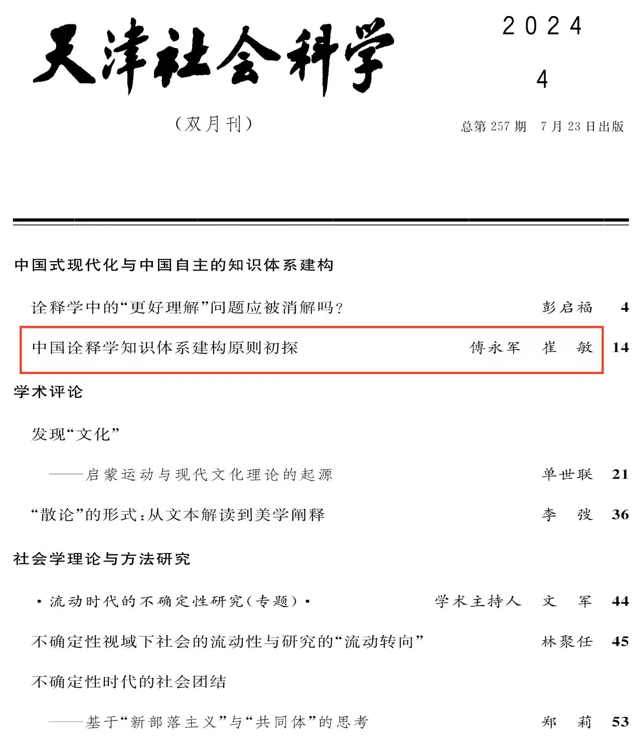 近日,申博sunbet傅永军教授与其博士研究生崔敏共同在《天津社会科学》 2024年第4期上发表了题为《中国诠释学知识体系建构原则初探》的高质量论文。