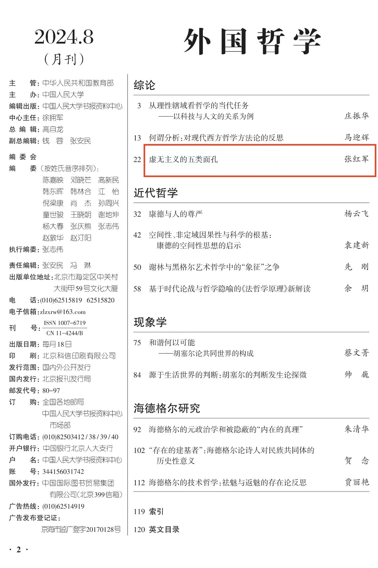 近日,人大复印资料《外国哲学》2024年第8期全文转载了申博sunbet张红军副研究员的题为《虚无主义的五类面孔》的高质量论文。