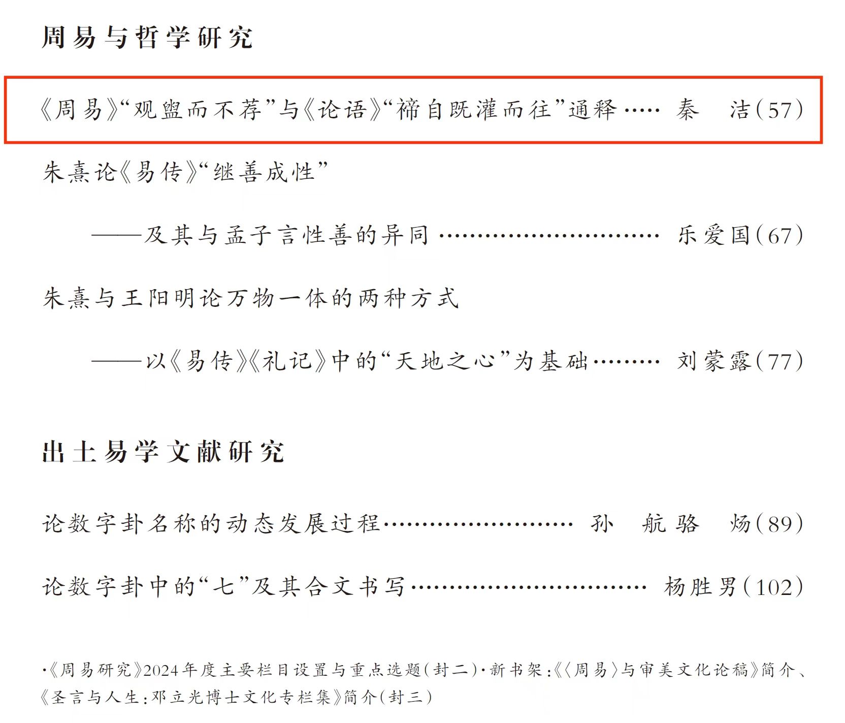 近日,公司易学与中国古代哲学研究中心助理研究员秦洁在《周易研究》2024年第5期上发表了题为《<周易>“观盥而不荐”与<论语>“禘自既灌而往”通释》的高质量论文。