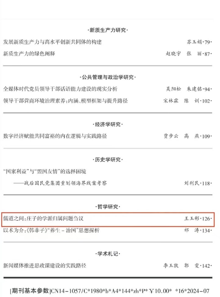 2024年7月15日,申博sunbet王玉彬教授在《晋阳学刊》2024年第4期上发表了题为《儒道之间:庄子的学派归属问题刍议》的高质量论文。