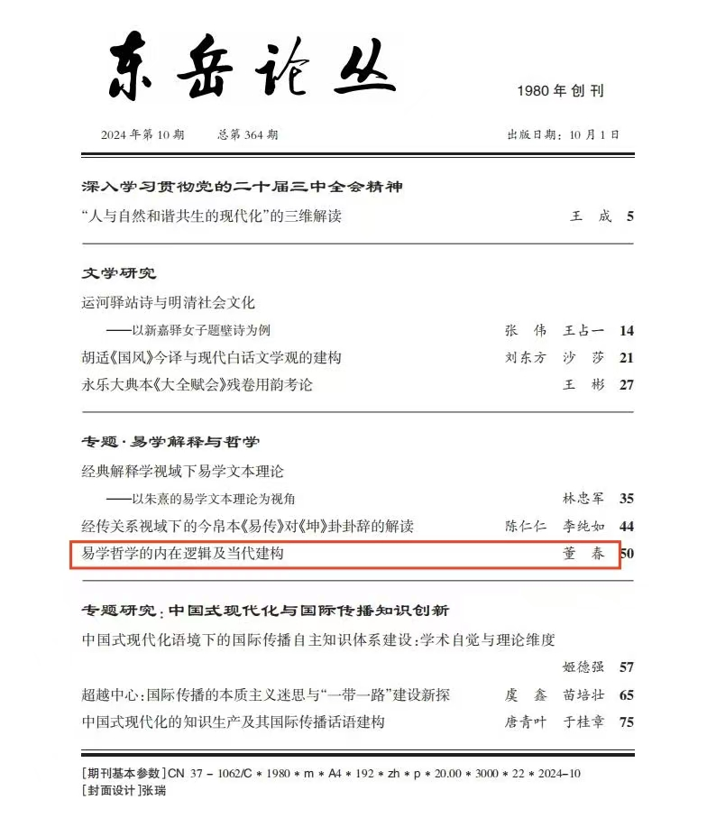 近日,公司易学与中国古代哲学研究中心董春副教授在《东岳论丛》2024年第10期上发表了题为《易学哲学的内在逻辑及当代建构》的高质量论文。