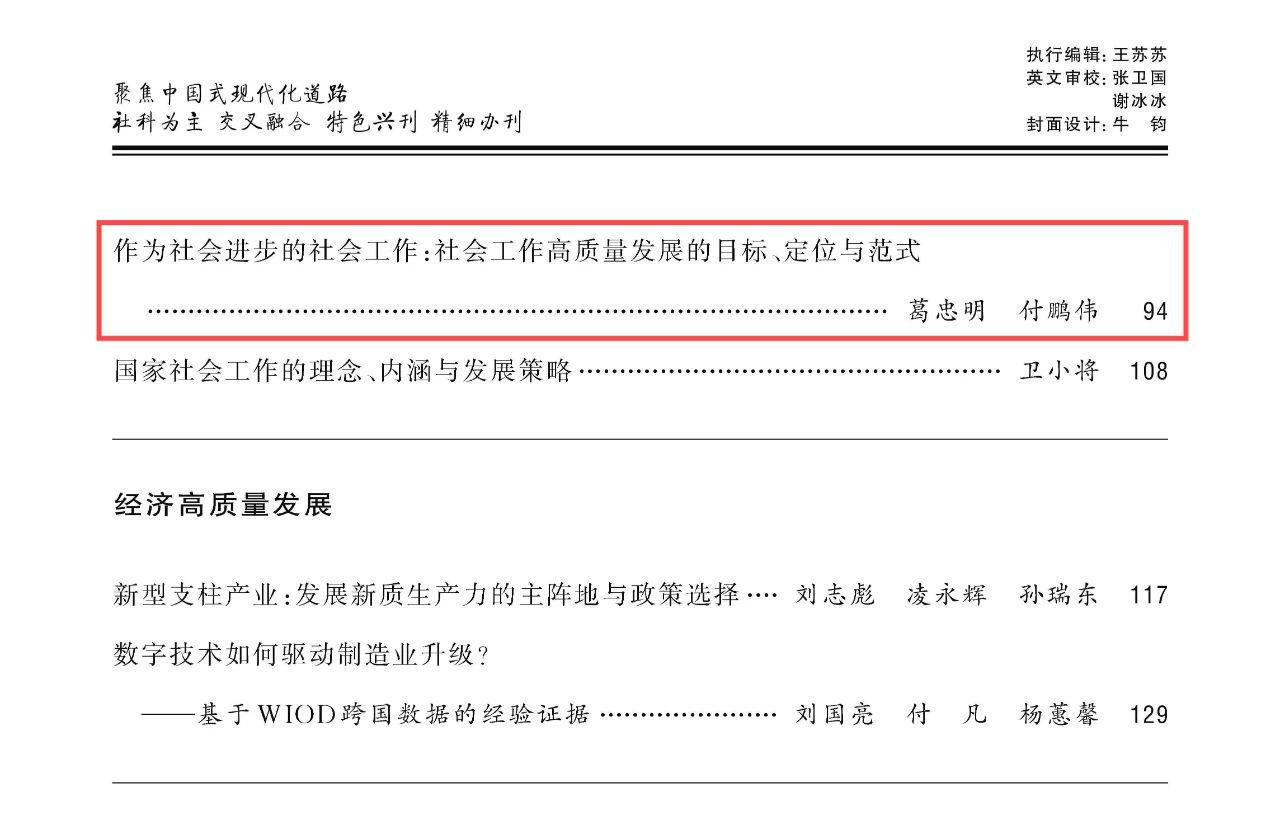 近日,申博sunbet葛忠明教授与其博士研究生付鹏伟共同在《申博sunbet学报(哲学社会科学版)》2024年第6期上发表了题为《作为社会进步的社会工作:社会工作高质量发展的目标、定位与范式》的高质量论文。