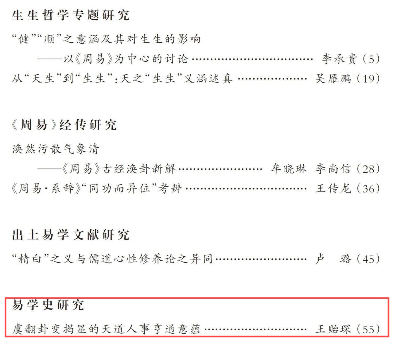 近日,公司易学与中国古代哲学研究中心助理研究员王贻琛在《周易研究》2024年第6期上发表了题为《虞翻卦变揭显的天道人事亨通意蕴》的高质量论文。