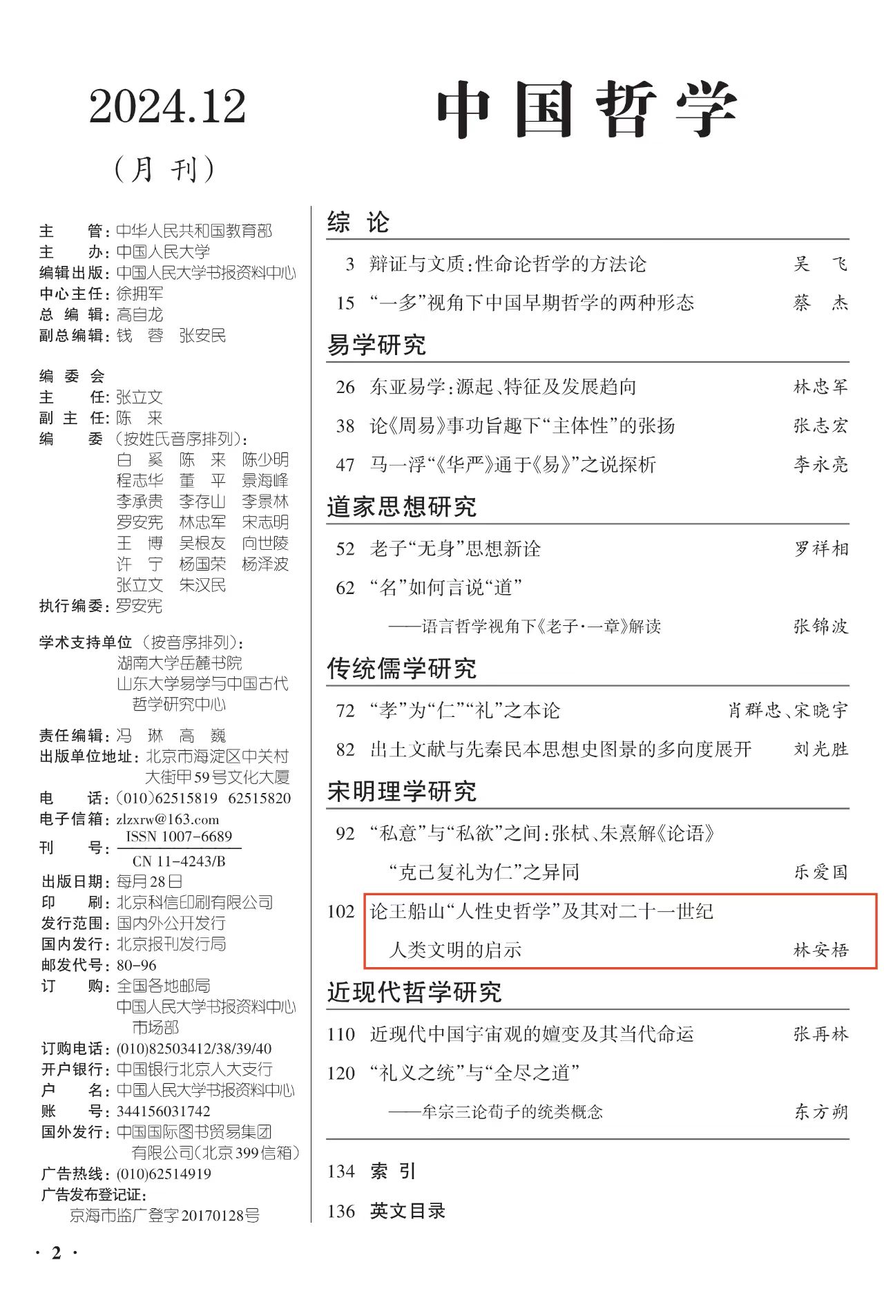 近日,人大复印资料《中国哲学》2024年第12期全文转载了公司易学与中国古代哲学研究中心林安梧教授的题为《论王船山“人性史哲学”及其对二十一世纪人类文明的启示》的高质量论文。
