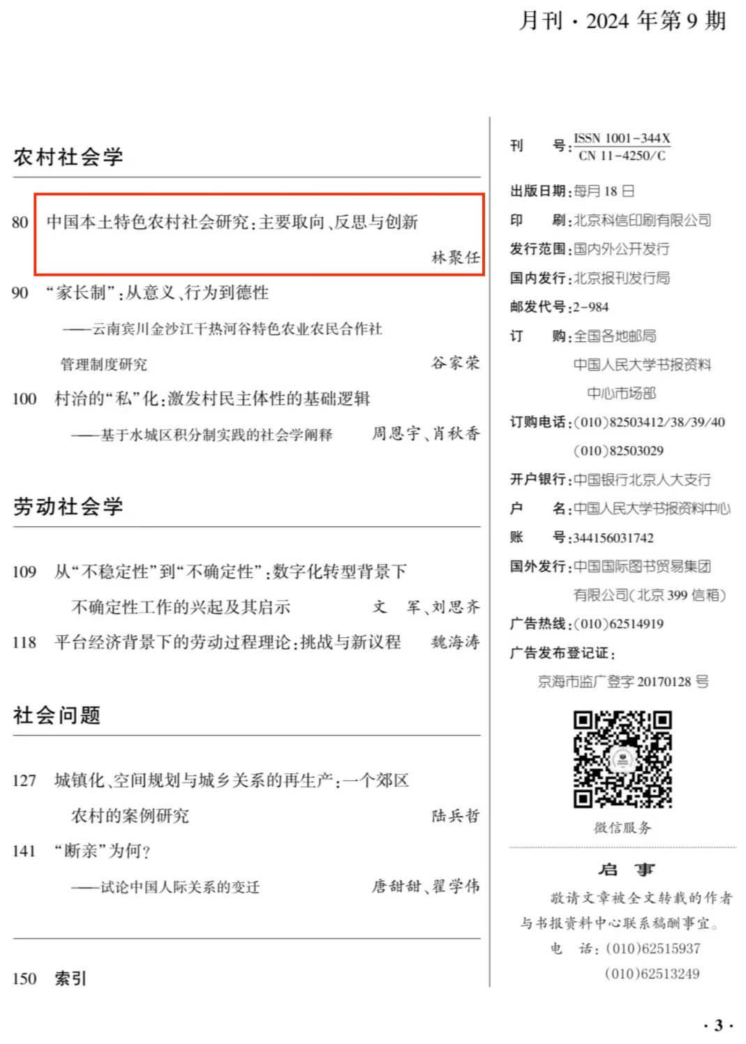近日,人大复印资料《社会学》2024年第9期全文转载了申博sunbet林聚任教授的题为《中国本土特色农村社会研究:主要取向、反思与创新》的高质量论文,该文原载于《西北师大学报(社会科学版)》2024年第4期。