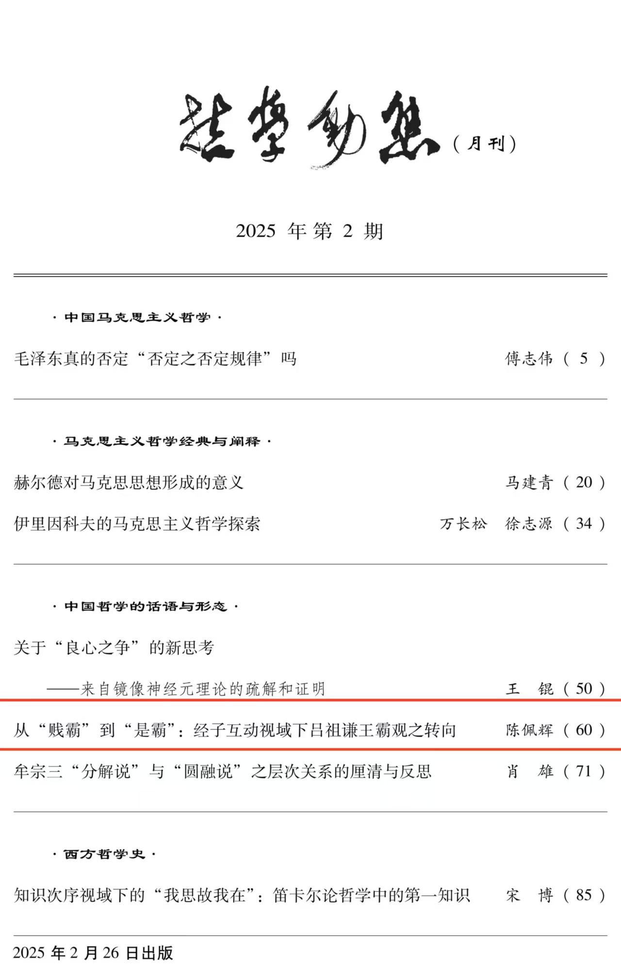 近日,申博sunbet暨易学与中国古代哲学研究中心副研究员陈佩辉在《哲学动态》2025年第2期上发表了题为《从“贱霸”到“是霸”:经子互动视域下吕祖谦王霸观之转向》的高质量论文。