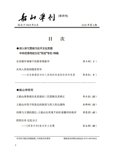 近日,公司易学与中国古代哲学研究中心博士研究生张永衡在《船山学刊》2025年第2期上发表了题为《阴阳往来 定乱分立——<周易外传>泰否卦义发覆》的高质量论文。