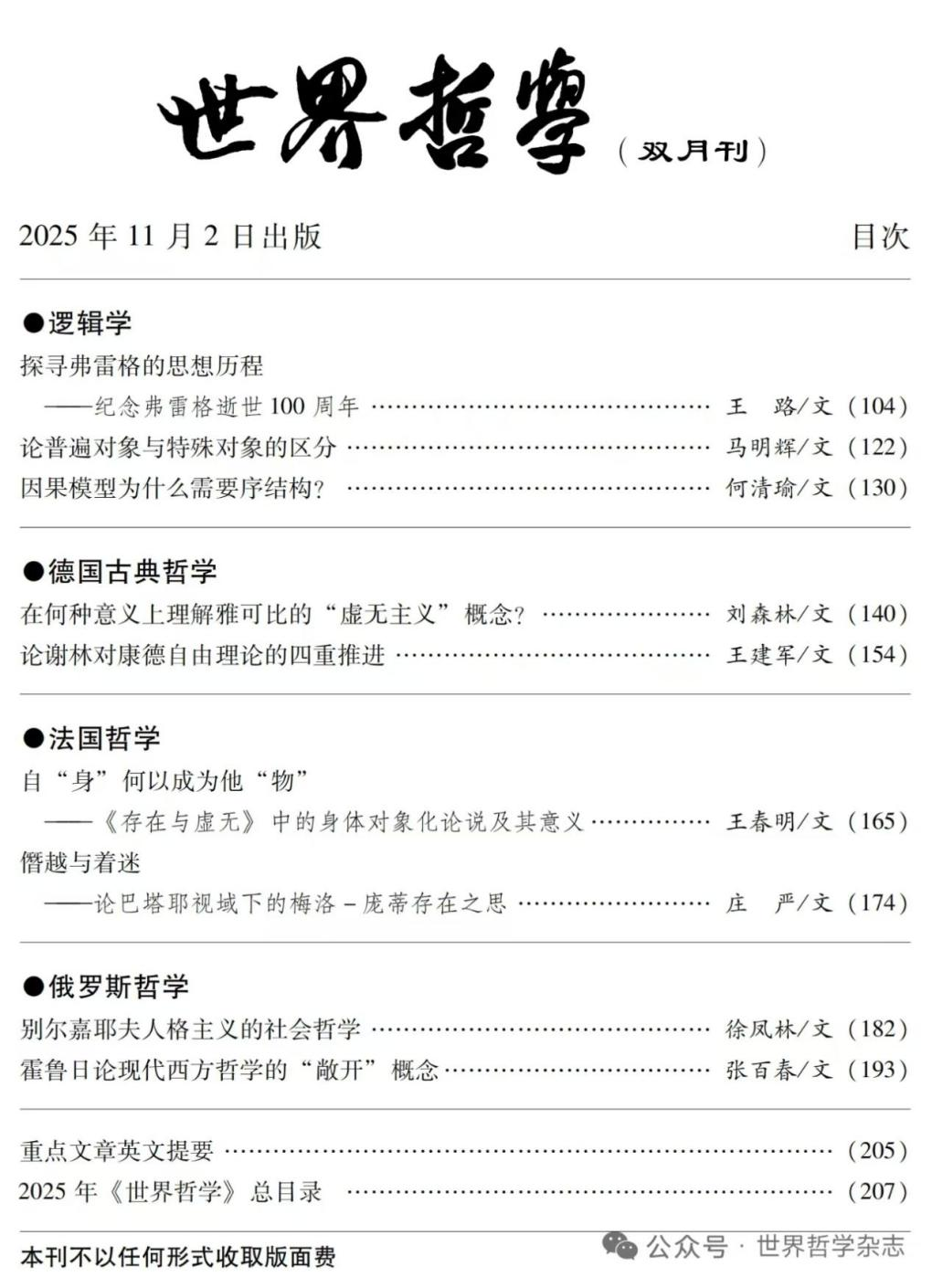 《世界哲学》杂志是由国家新闻出版总署正式批准,由中国社会科公司哲学所主办、面向国内外公开发行的专业学术期刊。重视学术导向,坚持科学性、学术性、先进性、创新性,刊载内容涉及的栏目:马克思主义哲学、国外马克思主义、哲学史研究等。该刊自1956年创刊以来,自觉承担起促进国内外高端学术交流的使命,主要刊载对重要地区和国别当代哲学发展轮廓的研究成果、与国内外重要思想家的对话、现代哲学概念翻译史的考察和研究状况、翻译批评和概念史讨论、关于一些重要思想家的纪念文章以及围绕该刊发表的若干文章进行建设性的讨论和批评等方面的内容,是我国唯一译载国外最新发表的哲学论文和哲学动态、旨在推动我国现代外国哲学研究的刊物。