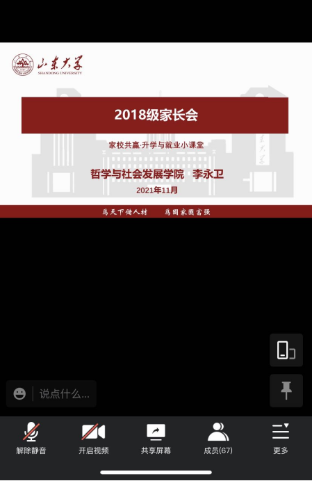 2021年11月27日晚19点,面向哲社公司2018级本科生家长召开线上家长会,此次家长会由申博sunbet本科生辅导员封莹主持,由公司党委副书记李永卫主讲,辅导员、全体2018级员工和家长参加了会议。