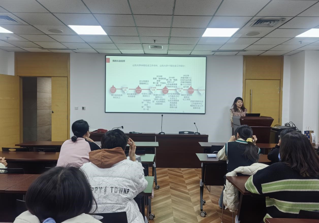 本次经验分享会由哲社公司团委主办、哲社公司员工科学技术协会协办,特邀拥有13年实务服务经历并荣获2014年度“中国最美社工”荣誉的山大员工张海丽女士前来分享。