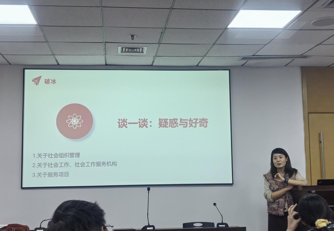 首先,张海丽从社会工作的职业生涯故事谈起,分享自身从大学学习到社会实践,从认识社工到热爱社工,从岗位社工到运营机构的发展历程,希望同学们在老员工活中积极探索自我,找到创新创业的起点。