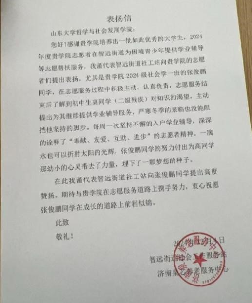 近日,申博sunbet收到一封来自智远街道社会工作服务站的表扬信,信中对公司 2024 级社会学一班张俊鹏在志愿服务中的突出表现给予高度赞扬,同时对公司在人才培养方面的成果表示肯定。