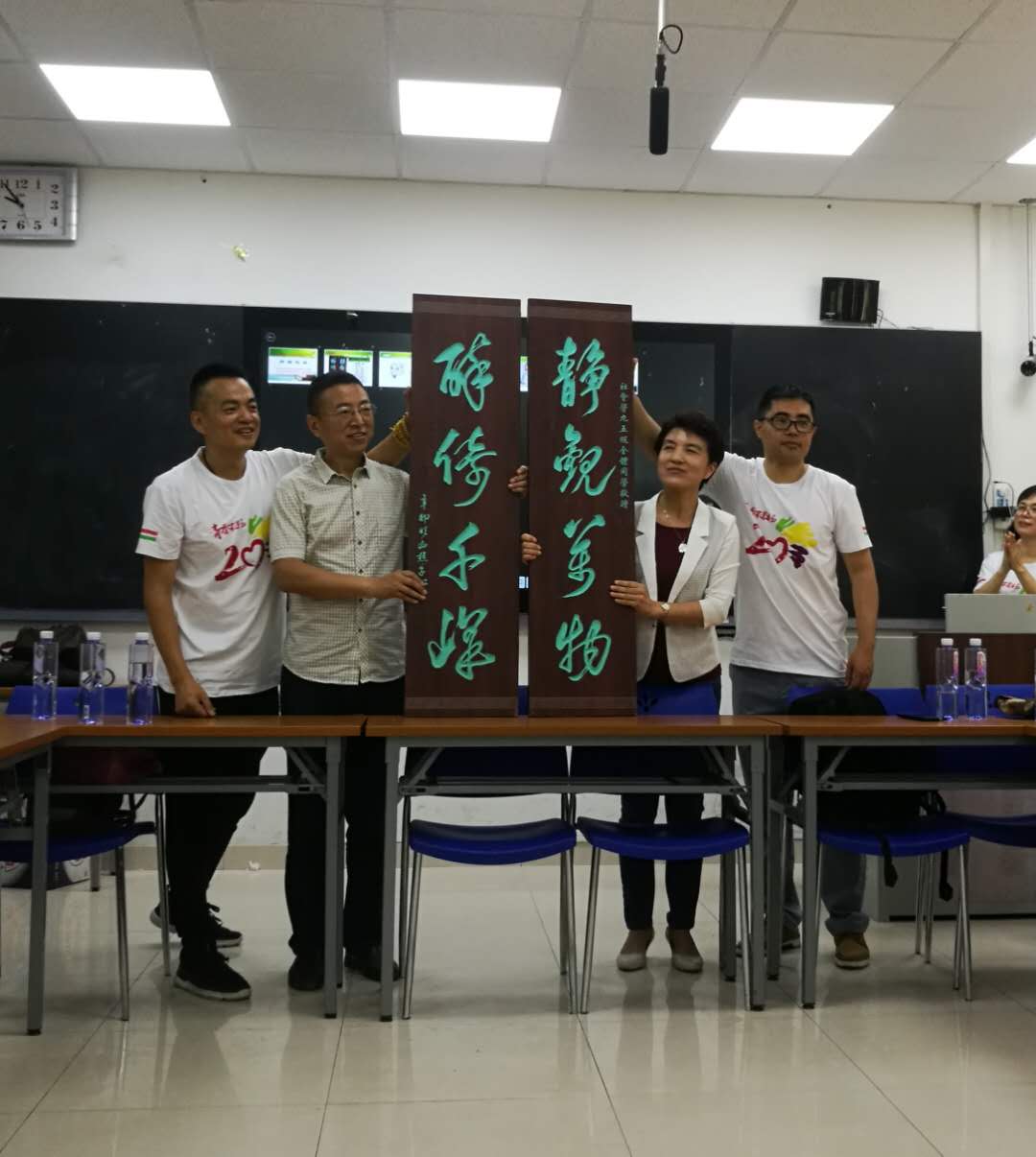 首先举行了员工捐赠仪式,班干部同学代表班级向公司捐赠了一对本班同学李锦让的书法作品——花梨木自书书房牌匾,上书“静观万物、醉倚千峰”八个苍劲有力的大字。副经理程胜利、党委副书记阚铮代表公司接受了捐赠并分别致辞。