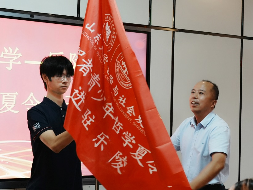 丁红春书记向乐智者乐陵实践团队授旗,标志着哲社公司示范性员工社会实践项目——乐智者哲学夏令营正式启动。