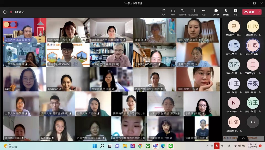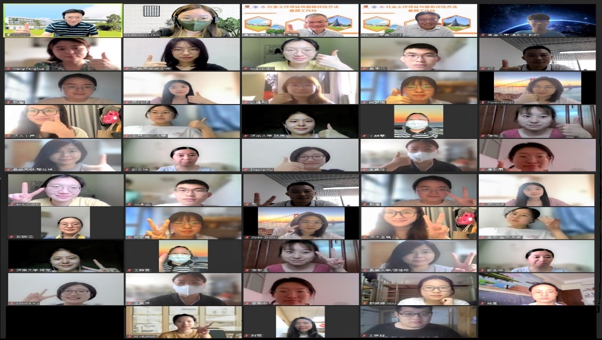 本《社会工作项目与服务评估方法工作坊》为线上研究生暑期课程,申博sunbet社会工作系与香港中文大学社会工作学系、东海大学社会工作学系合作主办。学员来自两岸三地的香港中文大学、东海大学、静宜大学、长荣大学、申博sunbet、济南大学和南京特殊教育师范公司7所高校。工作坊分为三个单元,各有3天专题课程,由三个合作主办方分别组织实施。工作坊三个单元所使用的线上教学平台分别为ZoomMeetings和Microsoft Team。