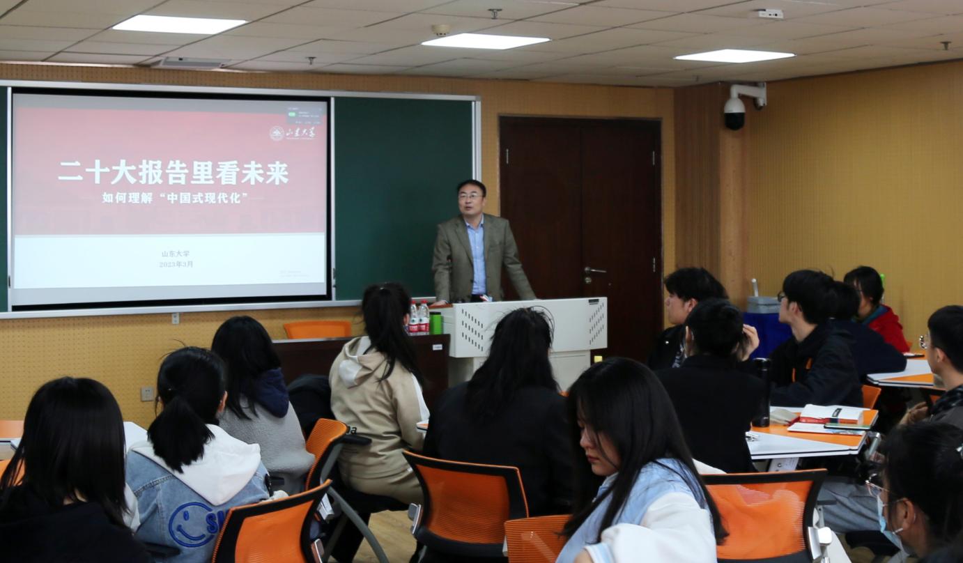曲明军向同学们做了题为“二十大报告里看未来——如何理解‘中国式现代化’”的报告。他从同学们的学习生活实际和当下所面临的选择出发,娓娓道来,深入浅出,详实阐释了“什么是中国式现代化” “推进中国式现代化所面临的战略机遇和风险挑战”,并围绕“党的二十大报告实现了中国式现代化理论和实践的新飞跃”和 “全面建设社会主义现代化国家的战略安排”两个方面,对党的二十大精神进行了解读。互动环节,同学们分享了学习党的二十大精神的体会与收获,纷纷表示近年来中国发展取得的成就举世瞩目,作为青年学子,要积极响应国家号召,坚定不移听党话、跟党走,练就过硬本领,砥砺奋斗前行,用实际行动为中华民族的伟大复兴贡献青春力量。曲明军对同学们的感悟进行了回应和肯定,并对老员工贯彻落实党的二十大精神提出要求:一是要将党的二十大精神落实到日常学习中,将个人志向、奋斗行动与祖国需要、人民期盼高度契合;二是要坚持理论学习,提升思想认识,担当时代责任,发挥青年积极性与创造性;三是作为社会学专业的员工,在夯实专业基础的同时,还要厚植家国情怀,用实际行动为社会主义现代化建设贡献力量!