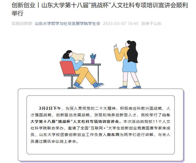 “启智识,兼知行,全环境立德树人常态化机制探索”文化建设项目”是哲社公司为传承山大文化血脉、发展特色哲社文化精心打造的文化品牌,成功入选公司“一院一品”文化建设项目。致力于通过阅典之知—— “吟典”经典文化诵读活动;启智之行—— “览岳”哲学本科生论坛;知行之路——社会学专业系列实地调研活动;嘤鸣之旅——“融创哲社”创新创业系列品牌;学思之维——做实做强“思想者”等系列品牌,打造多层次、宽领域的立体化宣传矩阵,并结合哲社公司兼具思辨性与实践性的学科特色,塑造传播正能量,涵养山大基因,致力于为公司加快构建具有中国特色、中国风格、中国气派的哲学社会科学贡献哲社智慧,为丰富山大文化内涵、熔铸新时代山大精神做出现实贡献。