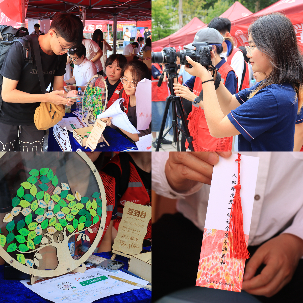 在迎新接待环节,70余名公司员工组织成员和志愿者以“微笑迎新,暖心服务”为工作宗旨,严格依循工作规范与接待程序,在现场开展接站引导、辅助签到、人像核验、扫码报到、资格审查、非遗体验等工作,竭诚为2024级新生及随行家长带去迅捷、便利、周到的接待服务。公司媒体与创意中心成员穿梭来往,引导新生及其随行家长在印有全体本科新生姓名的“你好,山大人”公司迎新展板前合影留念,为新生留下迎新日的美好留念。同时,公司为全体新生准备了“青春行囊”入学礼包:文创卡套与哲社文件袋兼具实用与美观,《知新文萃》与哲社专著尽显学术文化底蕴,新式藏青色院服标记出“哲社人”独特的风采。“枝语心愿”树形签到板、“明辨之门”身份核验台、“哲社通途”校园卡发放处、“携钥为家”宿舍钥匙分发点、“文韵风华”青春行囊发放处、“智群彩韵”漂染工艺体验台等展台协同配合,为全体报到新生带去流畅便捷的“一条龙报到、一站式服务”。醒目的深红欢迎条幅、全体迎新工作者温暖细致的服务、精致可爱的公司文创,令迎新现场满溢着家的温馨。