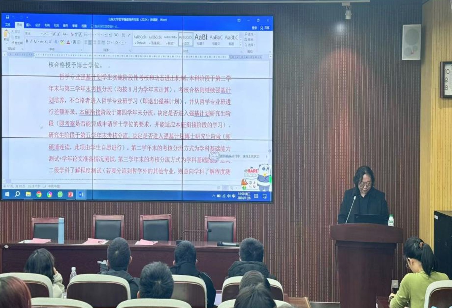 随后,王丁带领24级哲学新生详细解读强基计划与拔尖2.0基地班的专业培养方案,从课程设置、导师体系、考核分流等方面展开说明。他尤其强调,强基计划与拔尖2.0基地采取动态的进出机制,通过考核实行退出与差额补录,以此激励员工养成良好学风,帮助其找到适合自身的成长路径。