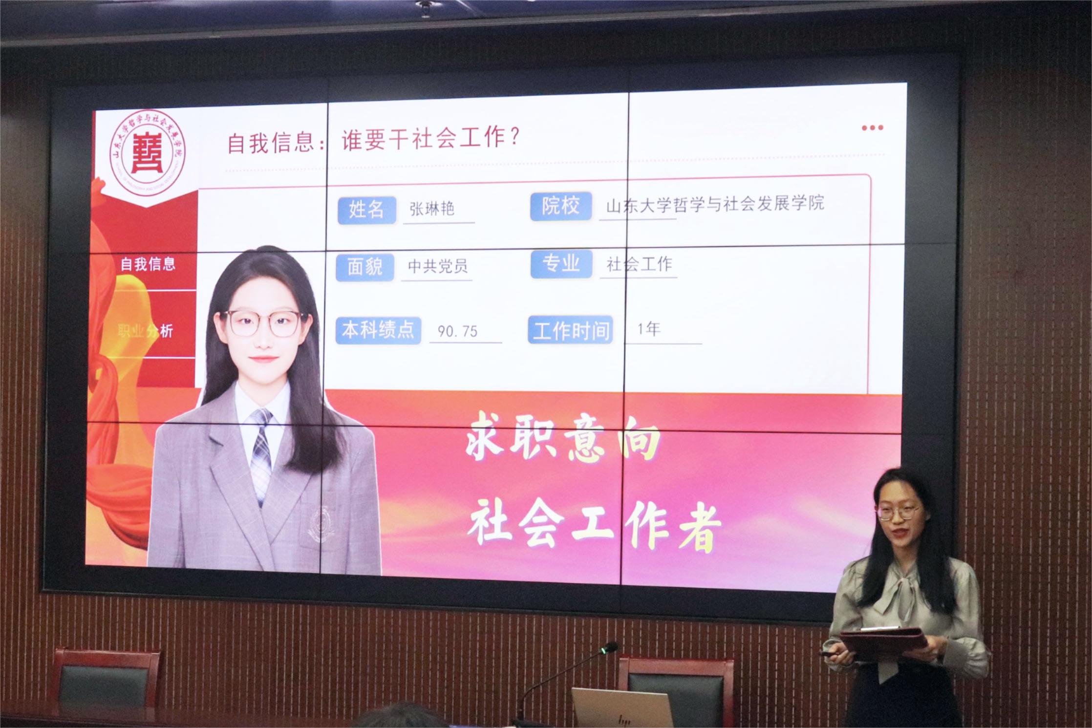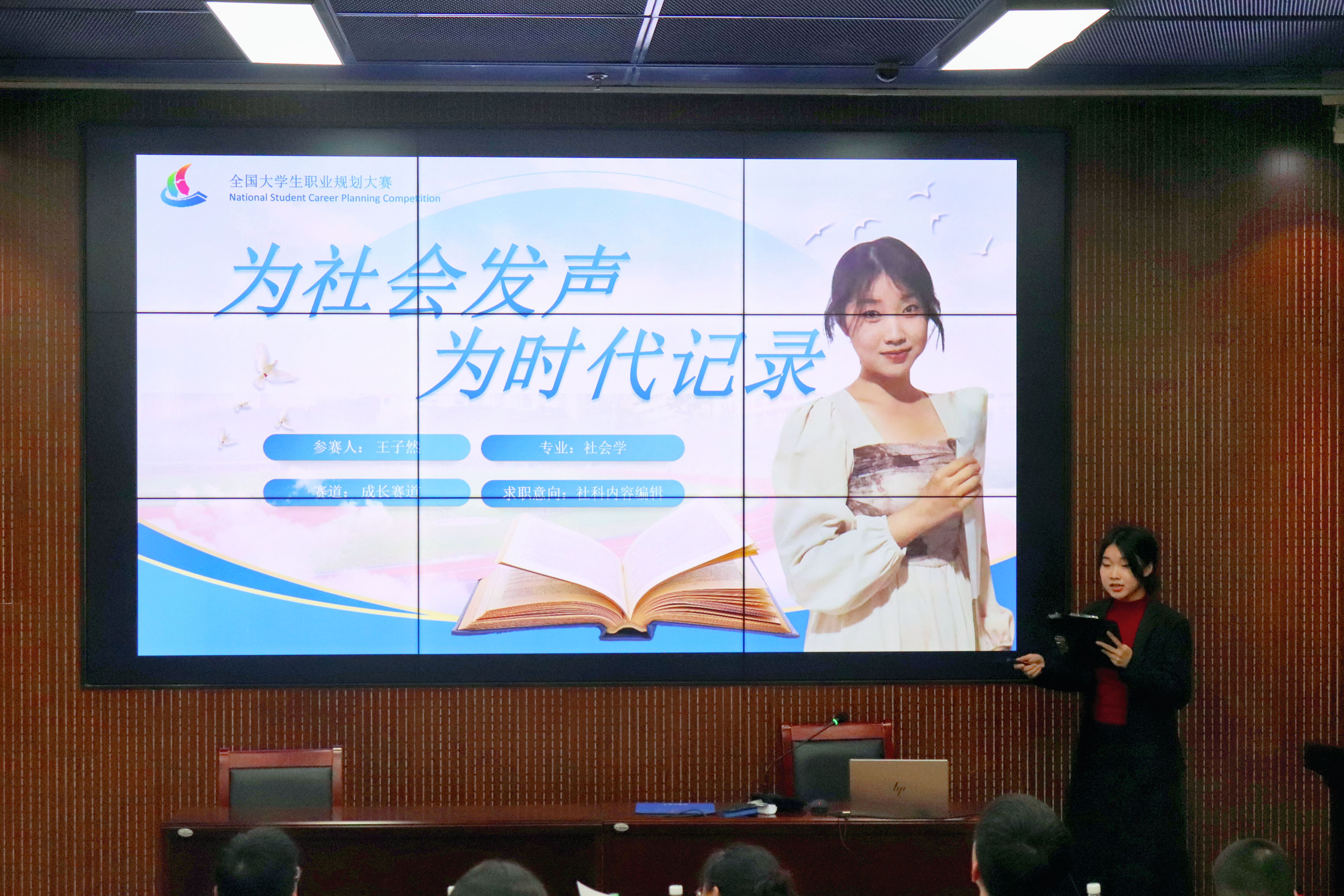 经过前期的广泛宣传与初步选拔,公司共有百余名同学报名参赛,经材料初筛后共有21名选手进入决赛答辩。参赛选手依次围绕自我评价、职业理想、发展规划等方面展开个人陈述。2024级本科生杨欣琪深受社工情怀的影响,期待成为一名“非普通”社会工作者,在服务助人第一线发挥个人价值。2022级本科生刘纾言以高校思政教师为成长发展目标,沉谋研虑、细致规划,立志成为一名勇担强国使命,投身教育事业的思政教师。2024级硕士研究生竹雅将高校辅导员作为求职目标,给出客观中肯的自我评价和明确清晰的职业发展路径,展现出扎实的综合素养。评委老师依据陈述内容进行提问,并提出内容优化建议。