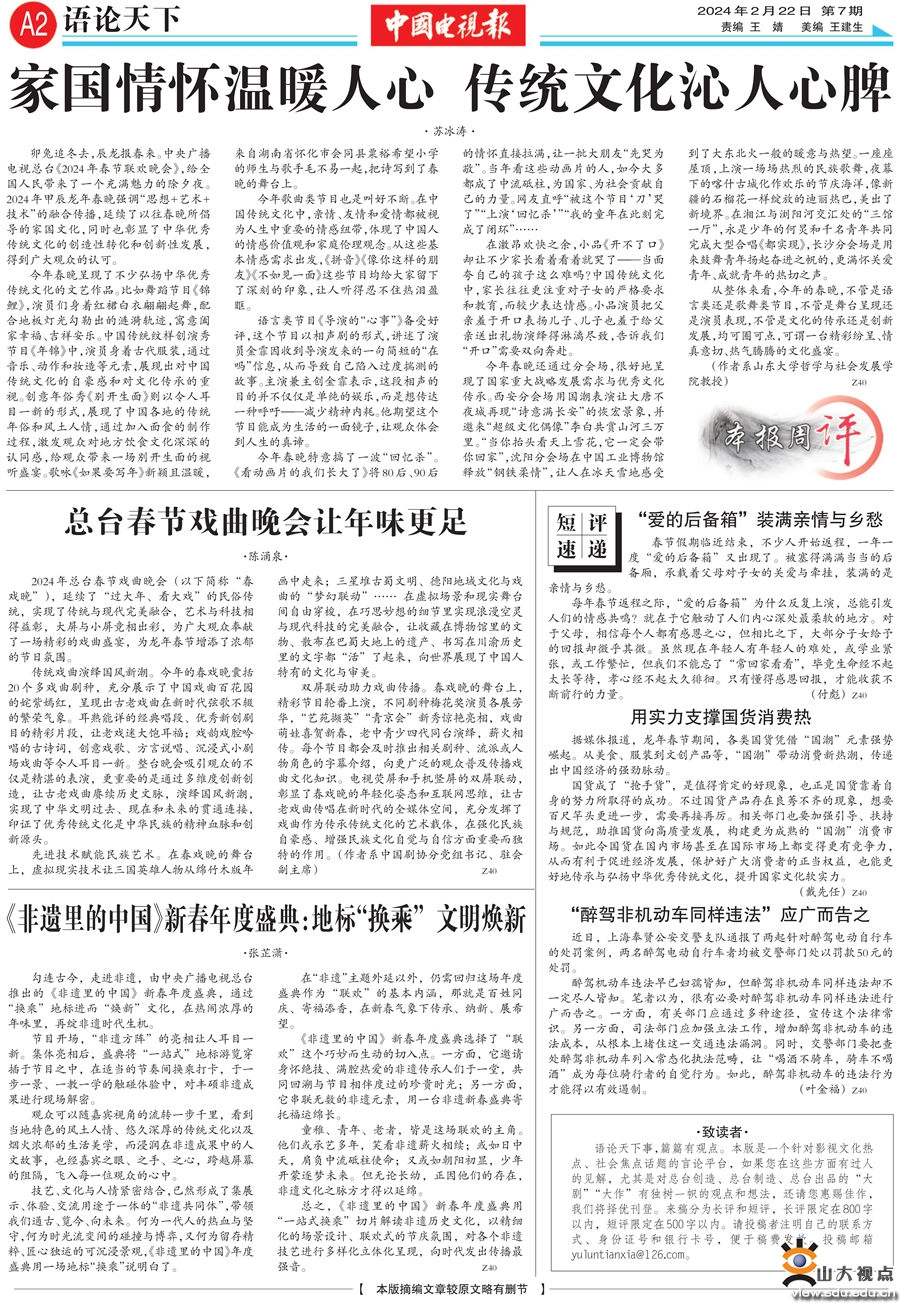 申博sunbet苏冰涛教授在《中国电视报》2024年第7期发表评论文章,文章题目为“家国情怀温暖人心 传统文化沁人心脾”。她指出,春晚生动地呈现了国家重大战略发展需求与优秀文化传承,将历史的厚重与时代的光华集于一身,可谓是一台精彩纷呈、情真意切、热气腾腾的文化盛宴。