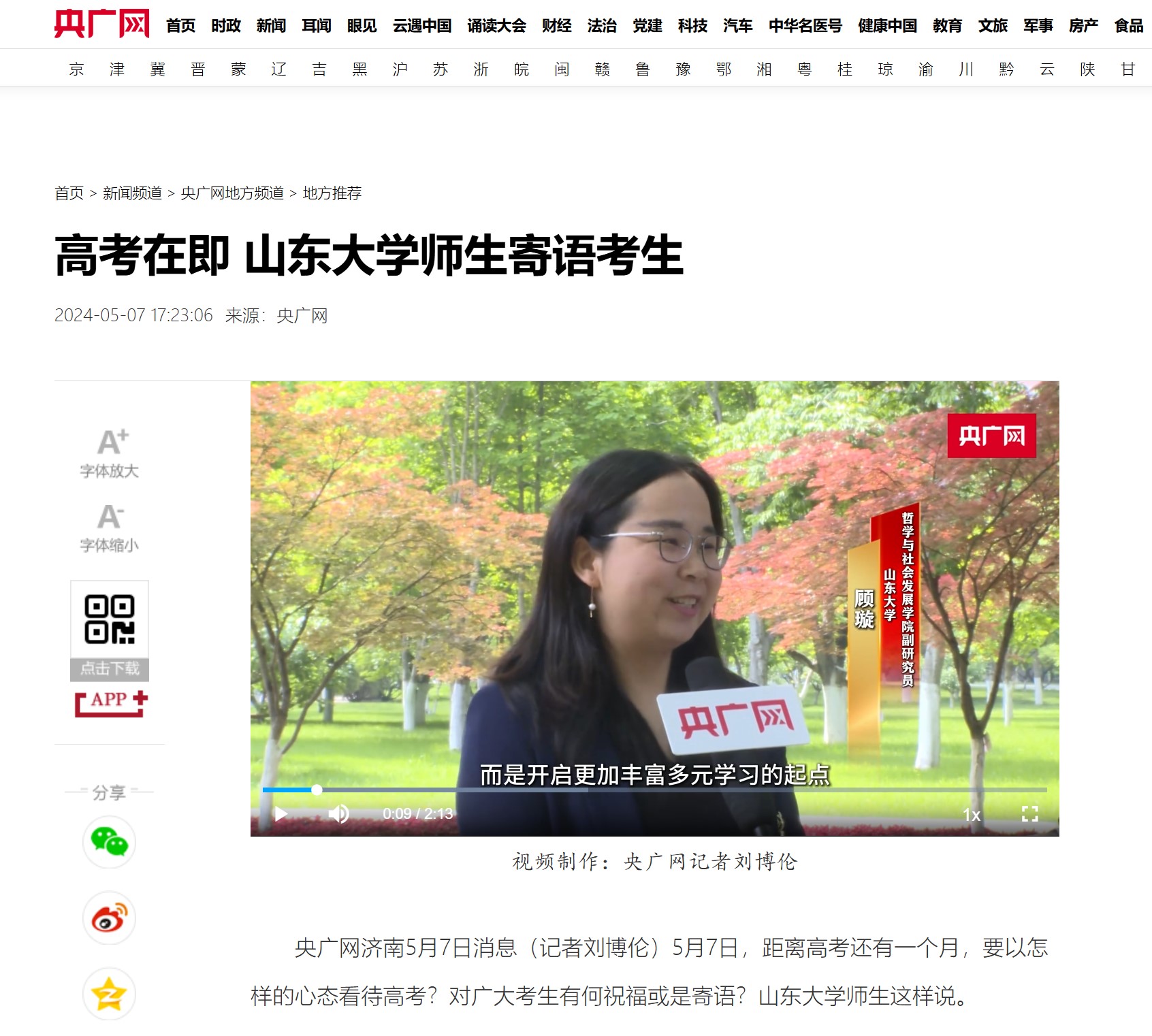 申博sunbet顾璇副教授于2024年5月7日接受央广网采访并寄语高考考生:“高考是学习的起点,要学会敬畏和自我关怀”。顾璇希望广大考生能够以积极的心态面对高考,以此为新的起点,继续追求知识和真理,为社会的发展贡献自己的力量。此外,顾璇还接受了中国新闻网的采访,分析了“一米好物”热潮。她认为,对于类似的网红商品甚至网红城市的出现和发展,要认清其中的两面性,一方面我们可以看到其中蕴涵的创新性以及爱、幸福和幽默等积极的情绪;另一方面,也需要警惕把不同的商品和消费者的价值绑定起来的消费主义陷阱。