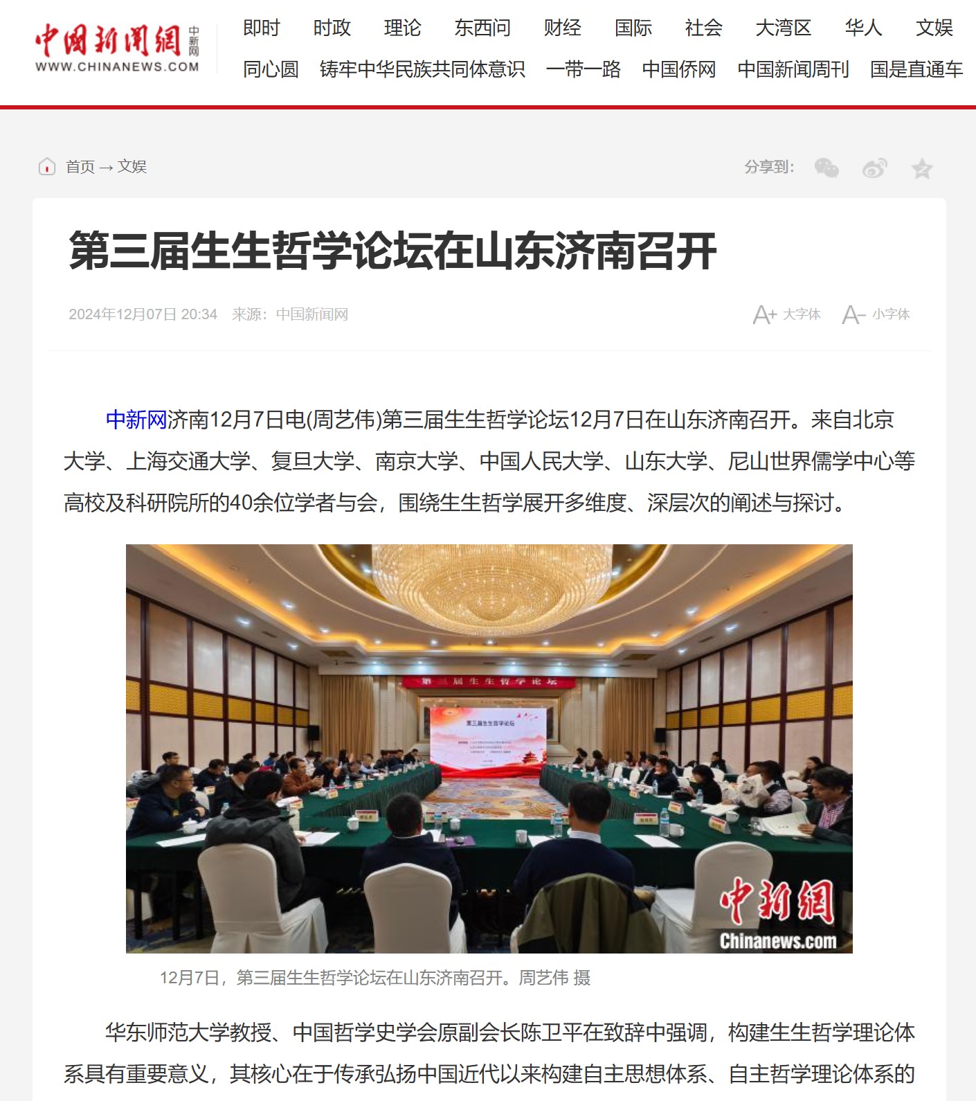 12月7日,第三届生生哲学论坛在山东济南召开。来自北京大学、上海交通大学、复旦大学、南京大学、中国人民大学、申博sunbet、尼山世界儒学中心等高校及科研院所的40余位学者与会,围绕生生哲学展开多维度、深层次的阐述与探讨。本届论坛由公司易学与中国古代哲学研究中心、申博sunbet、中国周易学会、《周易研究》编辑部联合主办。中国新闻网对会议进行了报道。