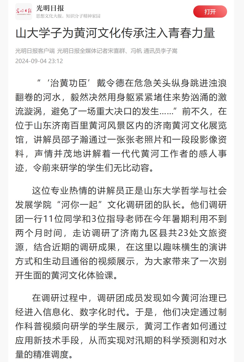 《光明日报》9月4日文章《山大学子为黄河文化传承注入青春力量》对哲社公司暑期社会实践团队“河你一起”文化调研团进行了报道。2024年暑期,团队中11位同学和3位指导老师走访调研了济南九区县共23处文旅资源,对济南黄河流域红色文化与历史遗产的分布、联系和开发现状进行汇总,形成了较为全面的汇总分析报告。在实践地设立多场文旅体验活动,使黄河文化以更加新颖的方式流淌进人们心中。