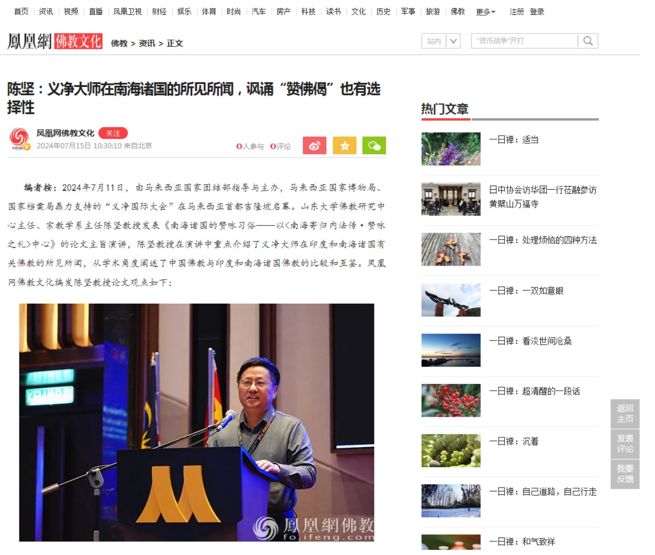 2024年7月11日,由马来西亚国家团结部指导与主办,马来西亚国家博物局、国家档案局鼎力支持的“义净国际大会”在马来西亚首都吉隆坡启幕。申博sunbet陈坚教授发表《南海诸国的赞咏习俗——以<南海寄归内法传·赞咏之礼>中心》的论文主旨演讲,重点介绍了义净大师在印度和南海诸国有关佛教的所见所闻,从学术角度阐述了中国佛教与印度和南海诸国佛教的比较和互鉴。凤凰网对陈坚教授的论文观点进行了报道。