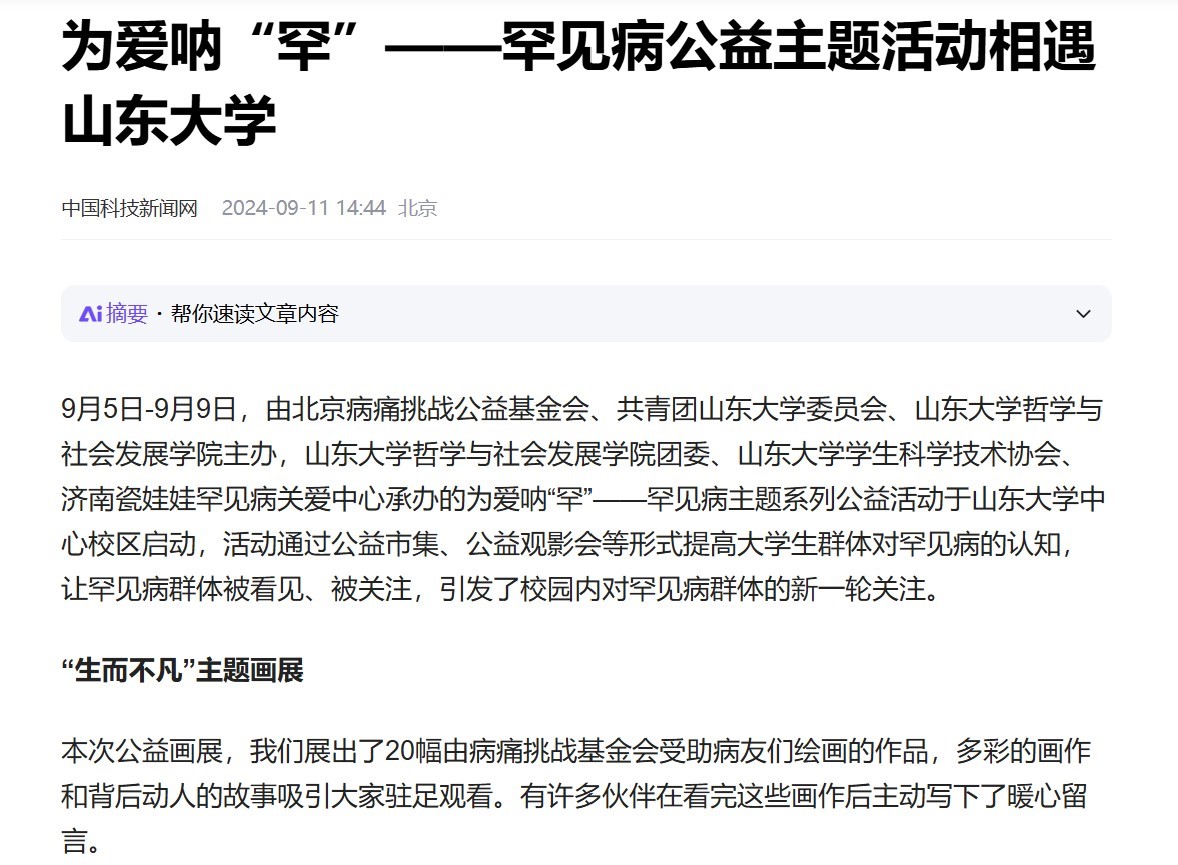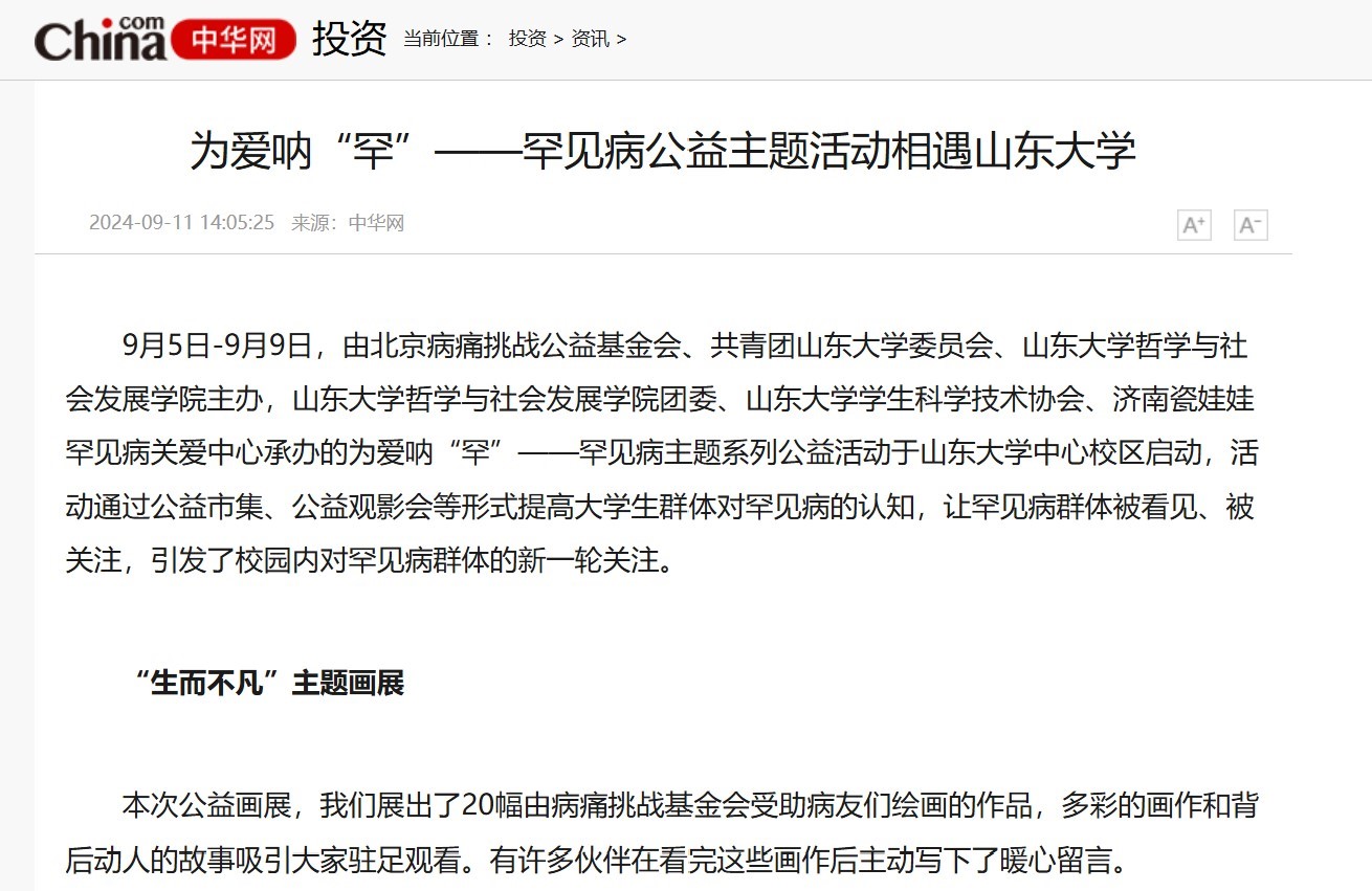 中华网9月11日文章《为爱呐“罕”——罕见病公益主题活动相遇申博sunbet》报道了由北京病痛挑战公益基金会、共青团申博sunbet委员会、申博sunbet主办的为爱呐“罕”——罕见病主题系列公益活动,该活动于9月5日-9月9日在申博sunbet中心校区举办,活动通过公益市集、公益观影会等形式提高老员工群体对罕见病的认知,让罕见病群体被看见、被关注,引发了校园内对罕见病群体的新一轮关注。