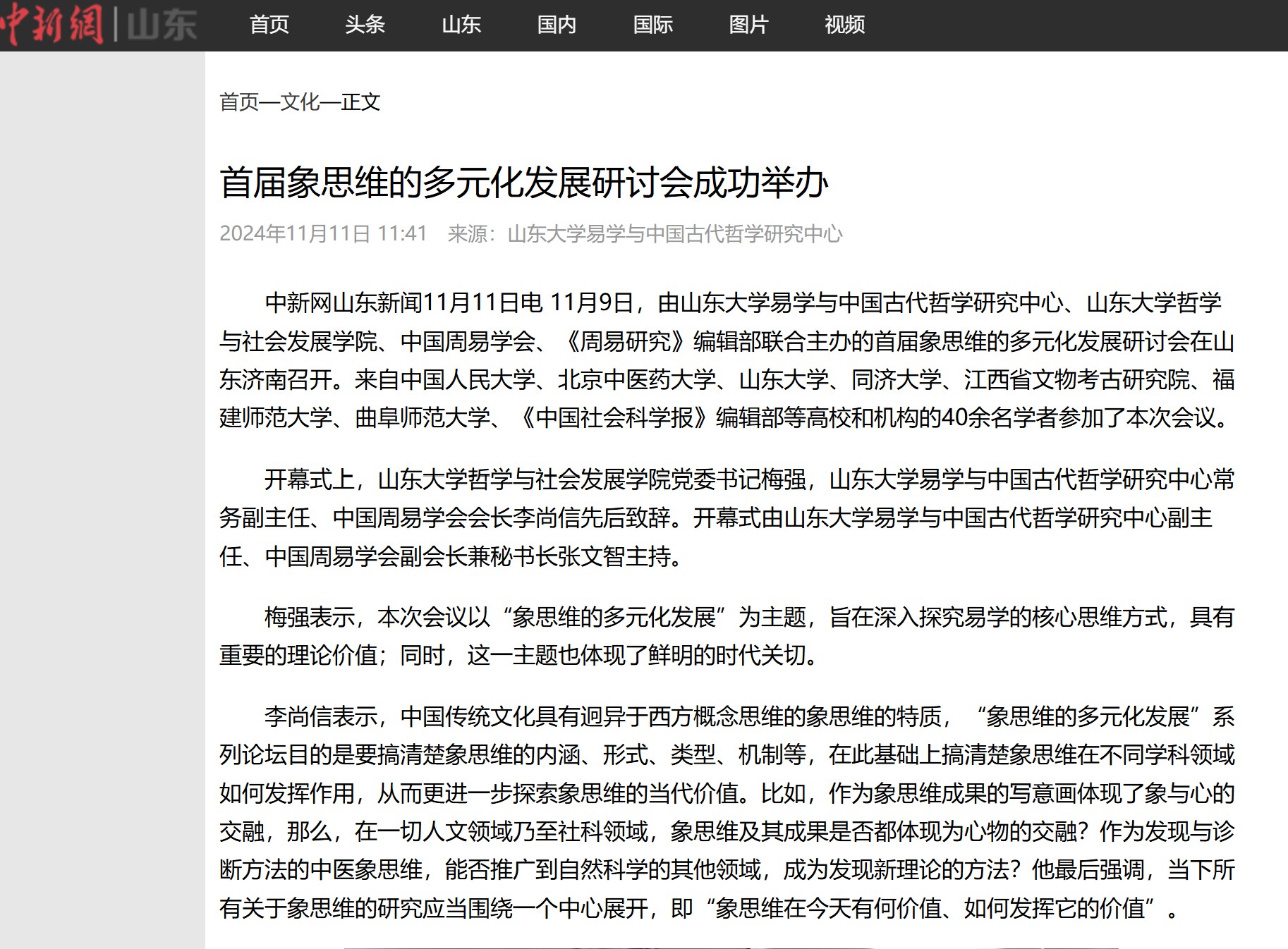 11月9日,由公司易学与中国古代哲学研究中心、申博sunbet、中国周易学会、《周易研究》编辑部联合主办的首届“象思维的多元化发展”研讨会在山东济南召开。来自中国人民大学、北京中医药大学、申博sunbet、同济大学、江西省文物考古研究院、福建师范大学、曲阜师范大学、《中国社会科学报》编辑部等高校和机构的40余名学者参加了本次会议。中国新闻网对会议进行了报道。