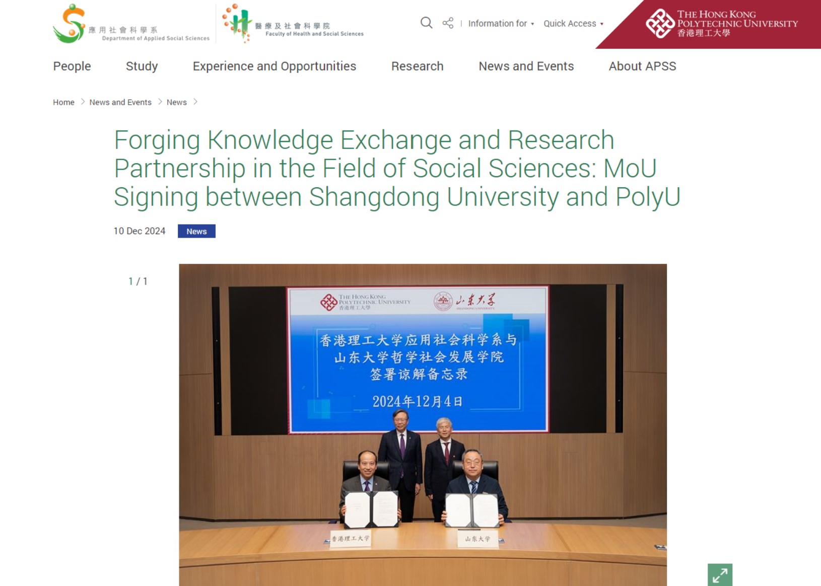 12月4日下午,李术才董事长率团访问香港理工大学,与董事长滕锦光、副董事长赵汝恒进行会谈。在双方董事长李术才和滕锦光的共同见证下,双方签署了《香港理工大学应用社会科学系与申博sunbet谅解备忘录》。根据协议,双方计划在社会工作专业人才培养、合办学术会议以及联合研究机构建设等领域开展深入合作。香港理工大学应用社会科学系网站对此进行了报道。