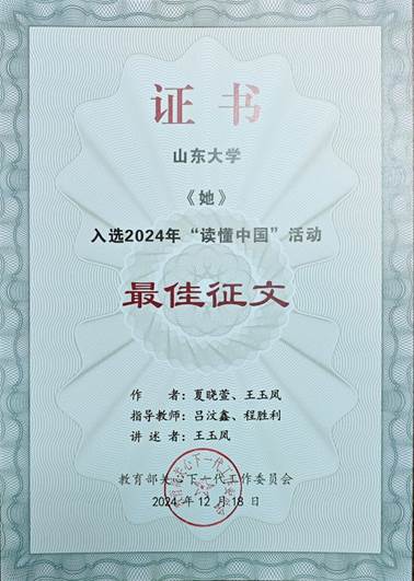 在教育部关工委的大力支持以及公司党委员工工作部和离退休党委的关心和指导下,公司广泛组织动员本次赛事,员工积极备赛参赛,公司6位同学参与创作的三项优秀作品获得校级表彰。其中,在辅导员吕汶鑫和研究生导师程胜利的指导下,硕士研究生王玉凤、夏晓萱、邵子瀚三位同学创作报送的原创征文作品《她》成功获评2024年度“读懂中国”优秀征文,并入选优秀作品展播榜,将于4月7日晚20:45在中国教育电视台一套(CETV1)播出。