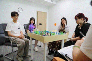 师生还与智善心理医院的经理、资深专家张敬悬教授进行座谈交流。同学们踊跃提问,就心理健康服务的实务操作与专业发展路径与张教授深入交流。随后,同学们分组体验了沙盘游戏、专业心理测试、艺术治疗绘画、生物反馈测试以及动物辅助治疗等项目。