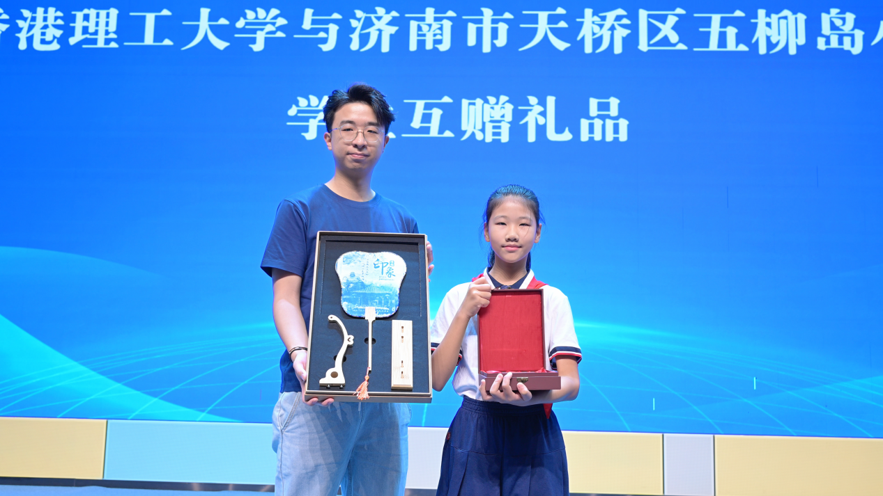 典礼上,最温馨的环节当属香港理工大学与五柳岛小学员工代表互赠纪念礼物。香港理工大学员工代表送上了象征公司及真诚问候的校徽,五柳岛小学员工代表则送上了公司蓝晒社团的精心之作——作品上清晰地印着“四面荷花三面柳”的优美诗句,这不仅是济南大明湖的真实写照,更是济南这座城市独特韵味的生动体现,传递着济南的文化底蕴。小小礼物承载着深厚的情谊,架起了两地学子心灵沟通的桥梁。