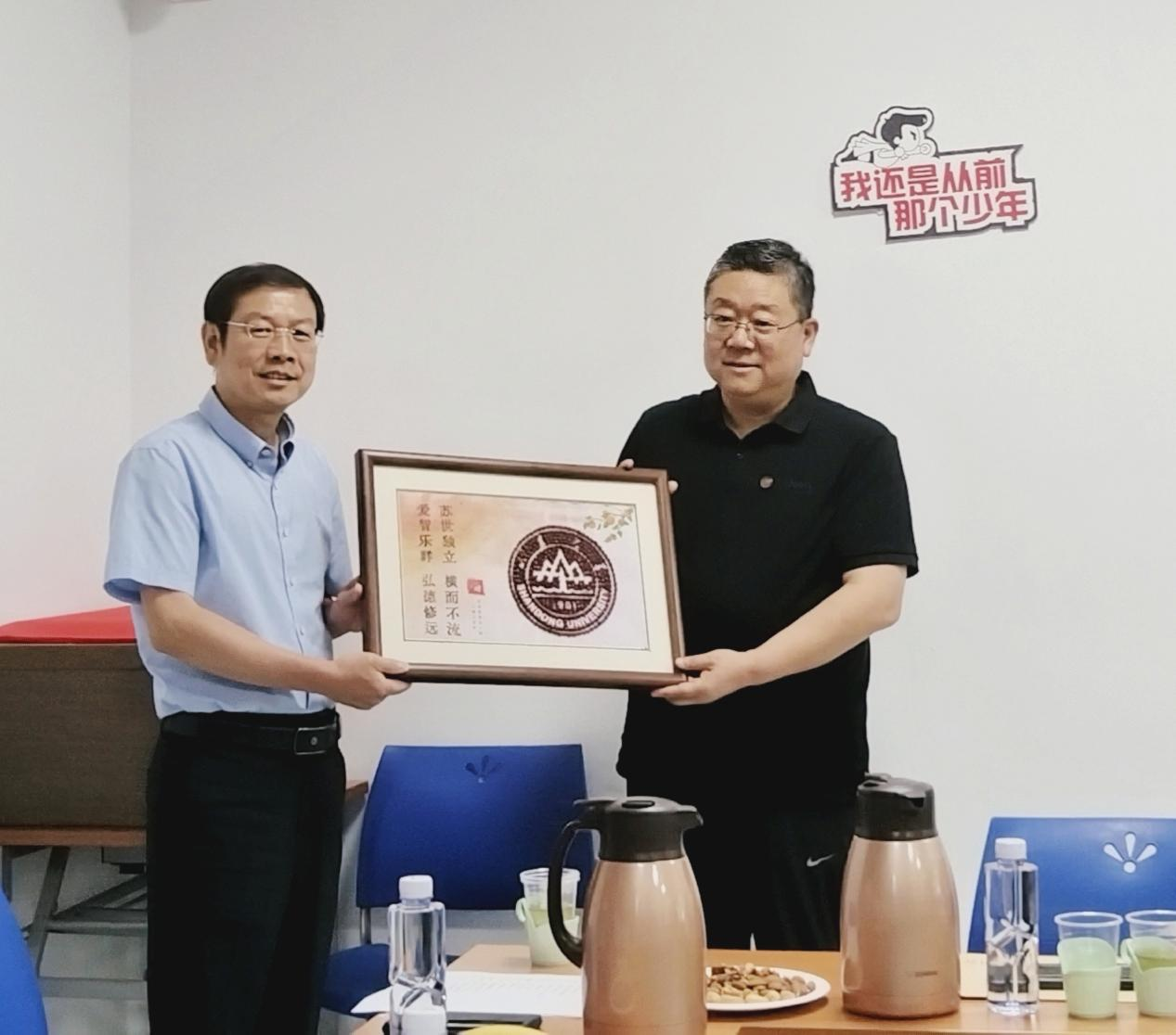 为表达对母校的感恩之情,团支部书记刘军向公司赠送了员工们精心准备的纪念品——一幅精心制作而成的“校徽院训种子粘画”,寓意"根系山大,叶茂四方"。
