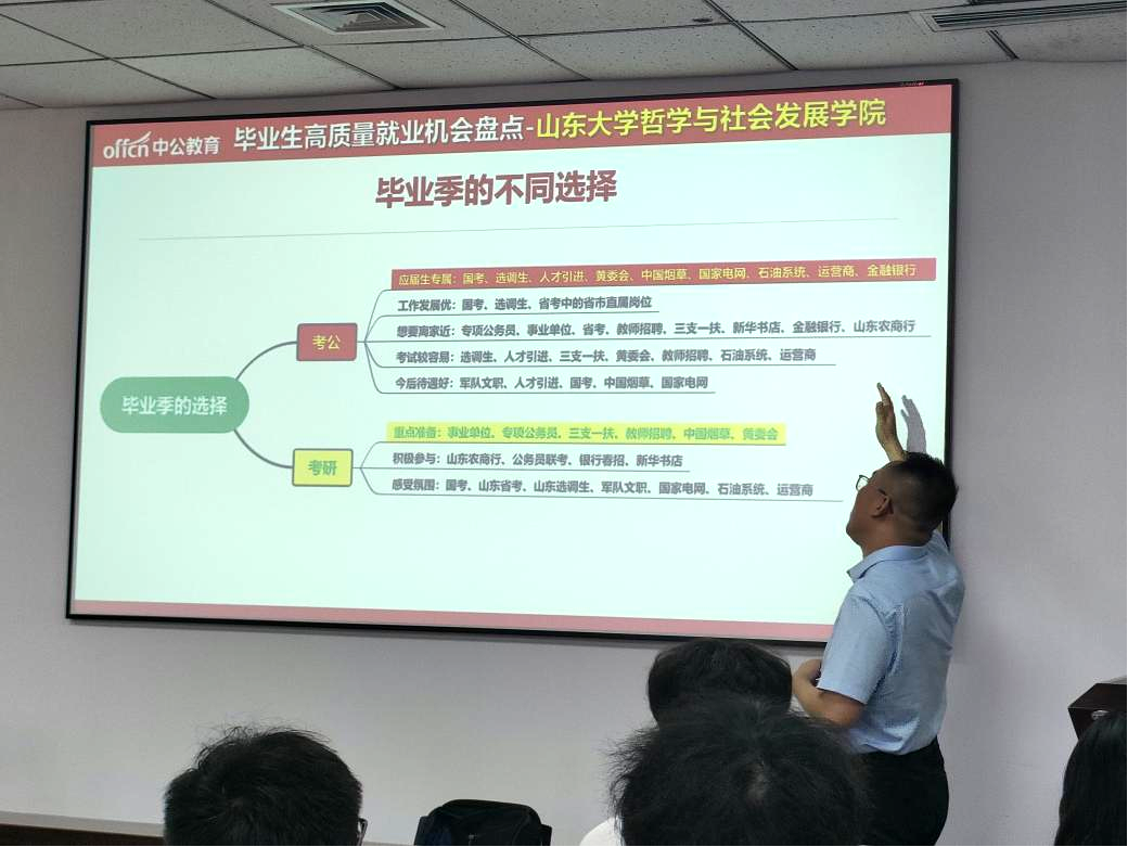 随后,公司邀请了专业生涯规划讲师从招考形势、信息获取、明确取舍等维度出发,针对毕业去向问题答疑解惑。他立足于“秋招—国考—选调—春招”的全周期节奏,重点解读国考、省考、选调、军队文职、事业单位、人才引进等优势报考路径,提醒同学们“用好应届身份、盯紧信息源头、早做复习规划”。会议现场,郝广义还就简历诊断、面试表达、时政积累等层面,面向全体22级同学给出求职素养提升方案。