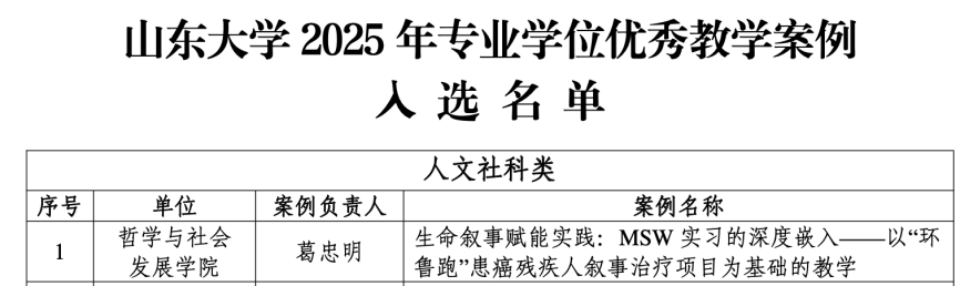 近日,申博sunbet公示了2025年专业学位优秀教学案例评选结果,全校共20项教学案例获奖。公司葛忠明教授团队申报的《生命叙事赋能实践:MSW实习的深度嵌入——以“环鲁跑”患癌残疾人叙事治疗项目为基础的教学》案例,荣获2025年专业学位优秀教学案例。申博sunbet副研究员亓彩云、2019级博士研究生张志海、2024级硕士研究生蒋骋宇、2024级硕士研究生尹洁参与服务及案例撰写。