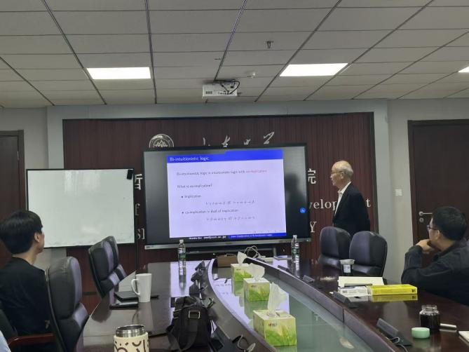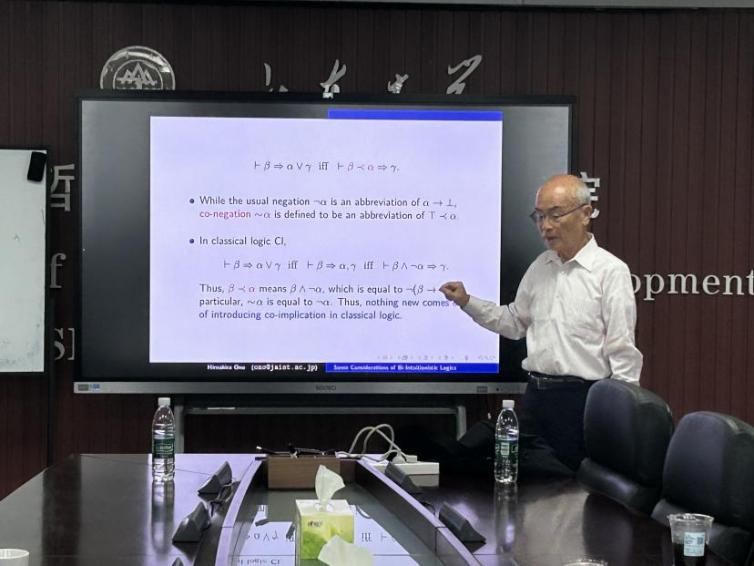 2025 年 9 月 22 日,“望岳——海外名师论坛”第14期在知新楼 A1618 举行。此次论坛邀请到日本北陆先端科学技术大公司大学小野宽晰教授做题为 “Some considerations of bi-intuitionistic logics” 的学术报告,报告由哲社公司梁飞老师主持。讲座前,梁飞老师先简要介绍了小野(Ono)教授的工作 —— 尤其是在“子结构逻辑”上成果的重要意义,且小野教授是少数在学术界获得广泛国际认可的亚洲逻辑学家,随后对小野教授到来表示欢迎。